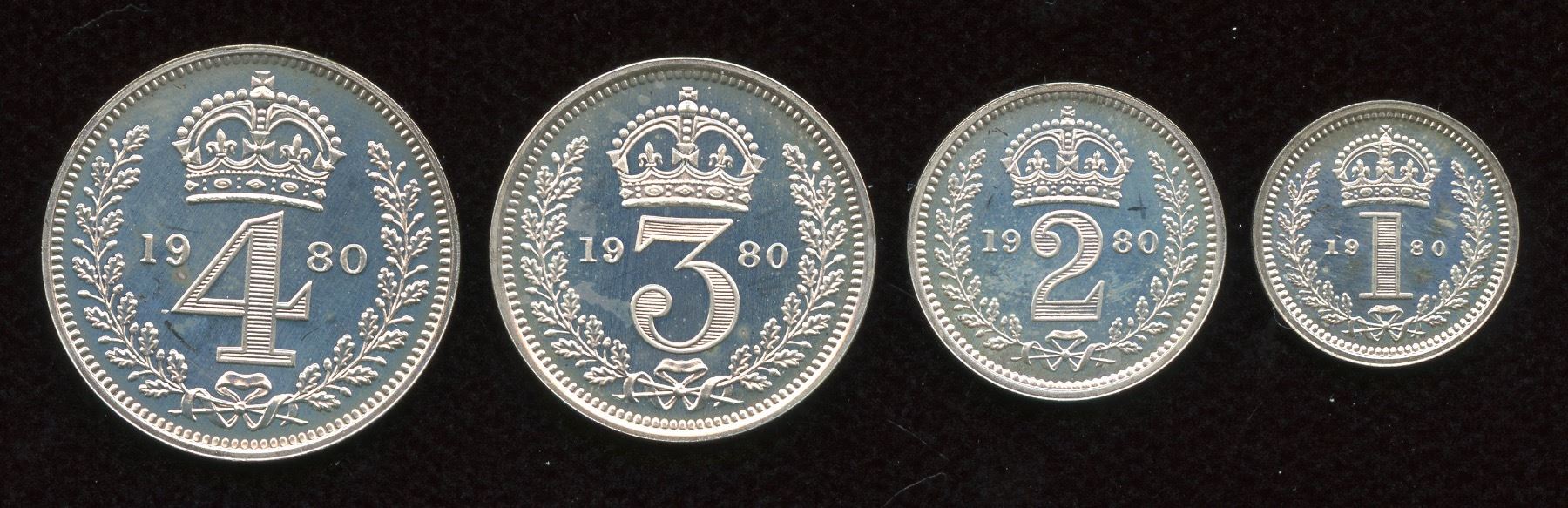 AR Maundy Set. Dated 1980. All coins (4): Bare head left / Crowned denomination mark within wreath. EF+. 4 Pcs.