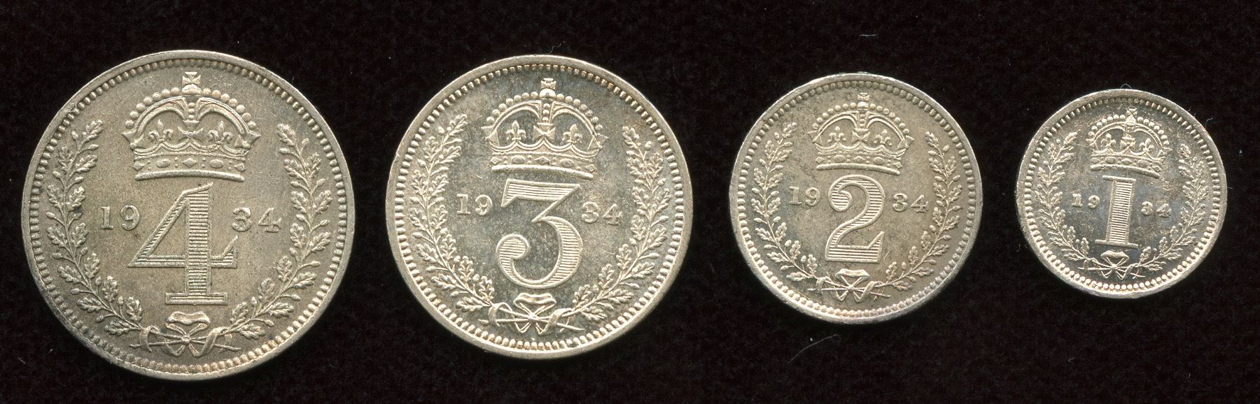 AR Maundy Set. Dated 1934. All coins (4): Bare head left / Crowned denomination within oak wreath. EF. 4 Pcs.