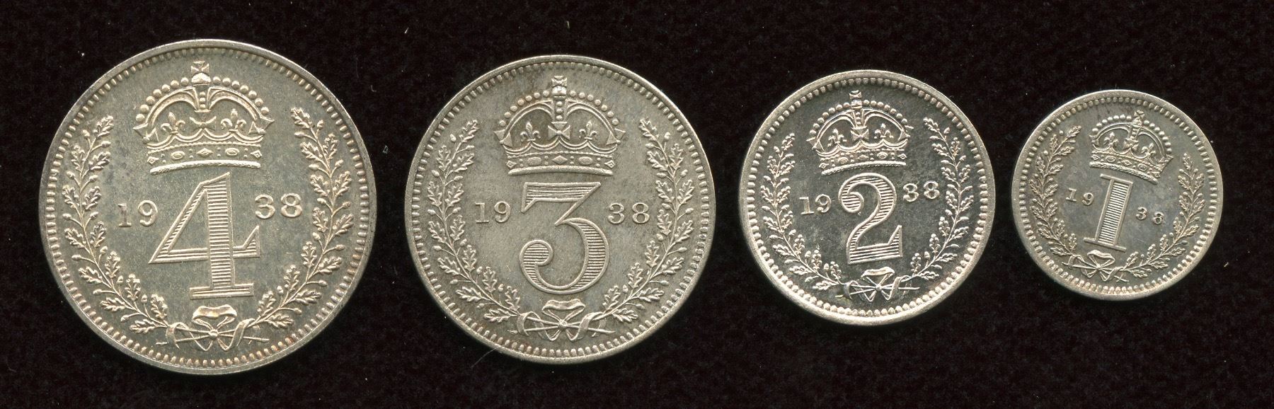 AR Maundy Set. Dated 1938. All coins (4): Bare head left / Crowned denomination mark within wreath. EF. 4 Pcs.