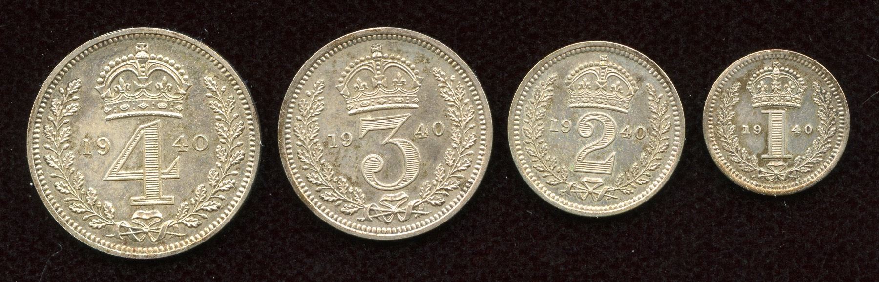 AR Maundy Set. Dated 1940. All coins (4): Bare head left / Crowned denomination mark within wreath. EF. 4 Pcs.