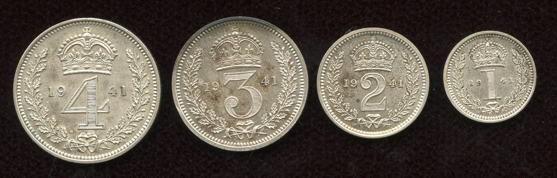 AR Maundy Set. Dated 1941. All coins (4): Bare head left / Crowned denomination mark within wreath. EF. 4 Pcs.