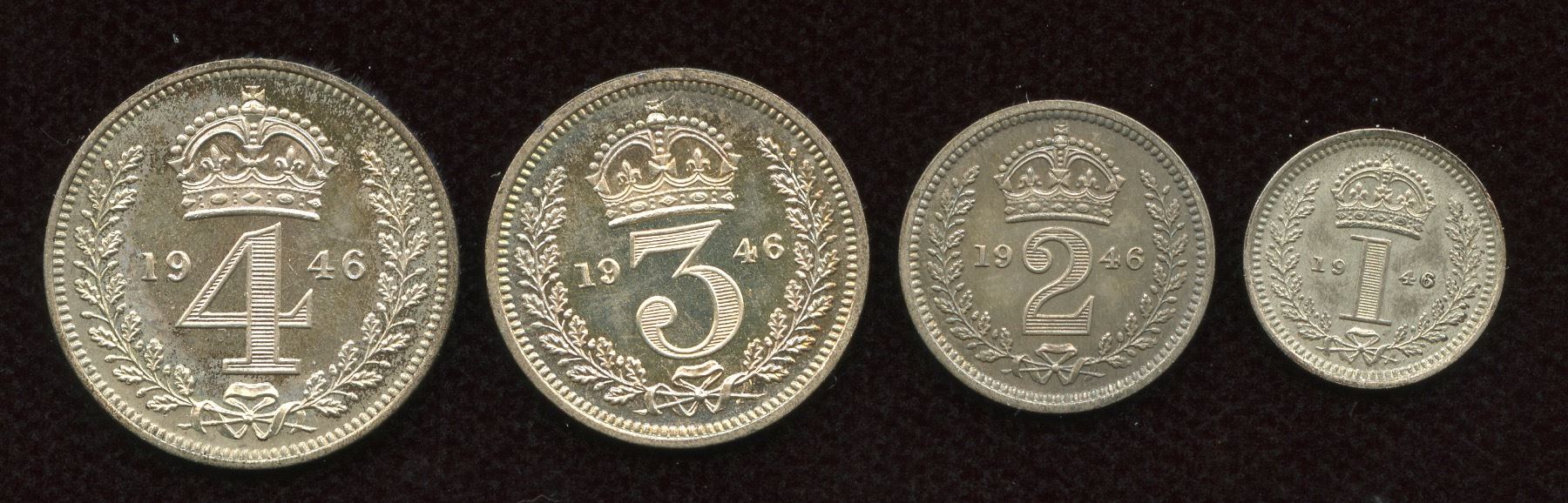 AR Maundy Set. Dated 1946. All coins (4): Bare head left / Crowned denomination mark within wreath. EF. 4 Pcs.