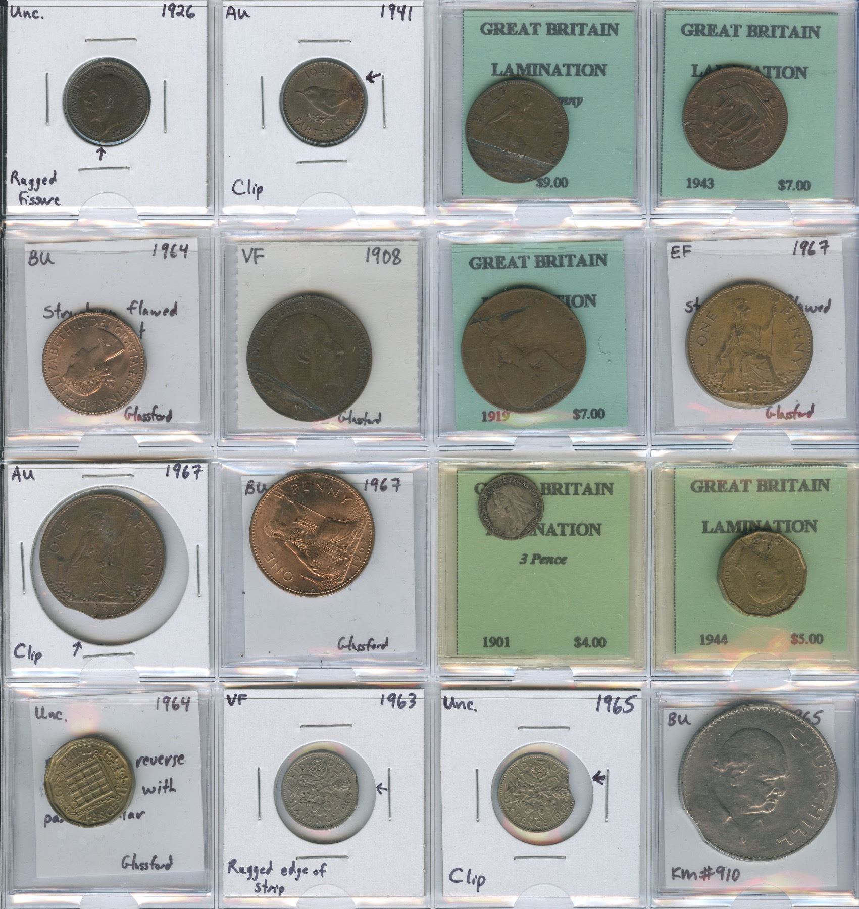 Lot of 16 Great Britain pre-decimal coin errors, ranging from Farthing to Crown, 1901 to 1967. Some errors are significant, including the 1965 Churchill crown with a clip, which are almost unheard of. Patrick Glassford Collection.