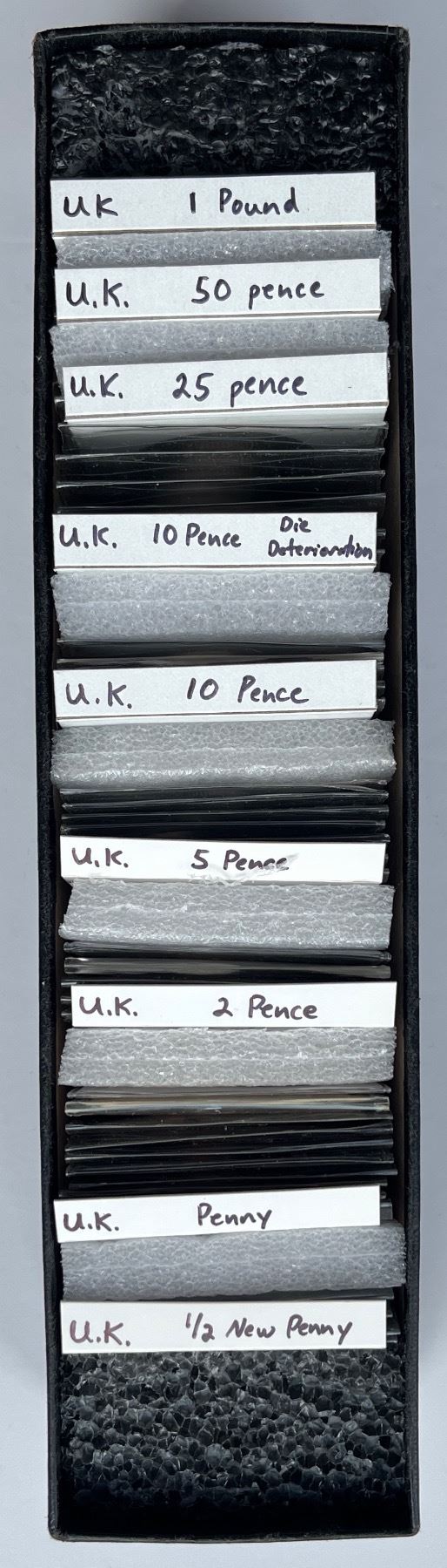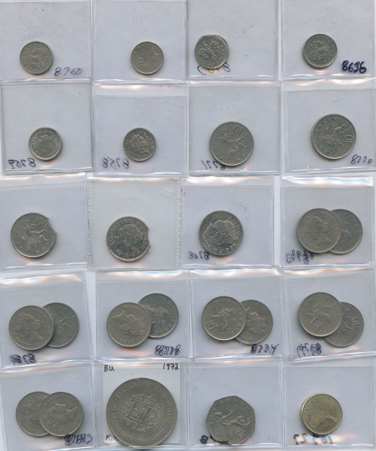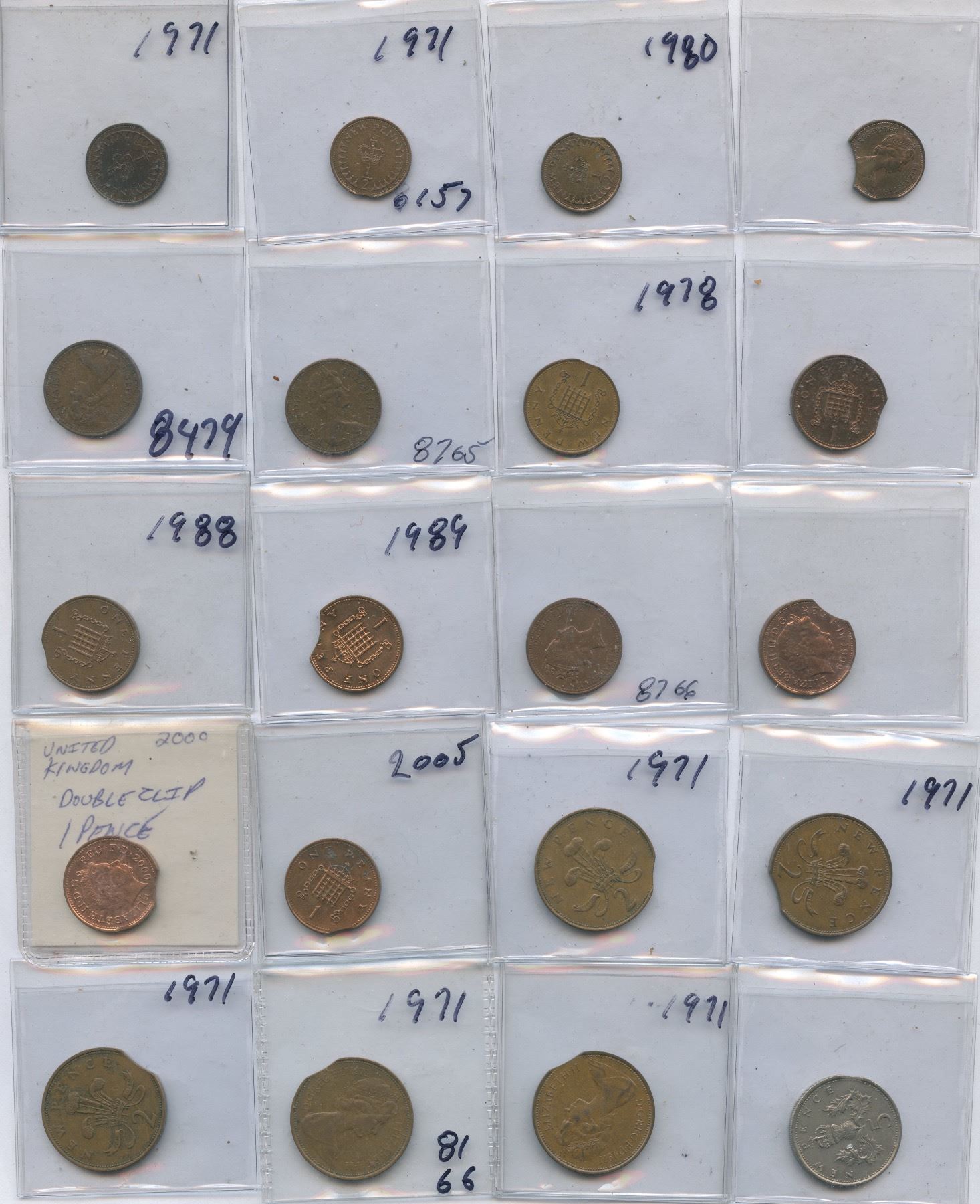 Lot of 40 Great Britain decimal coin errors, 1971 and newer. Some errors are significant, while others are minor. Coins are in various condition, from VF to BU. Patrick Glassford Collection.