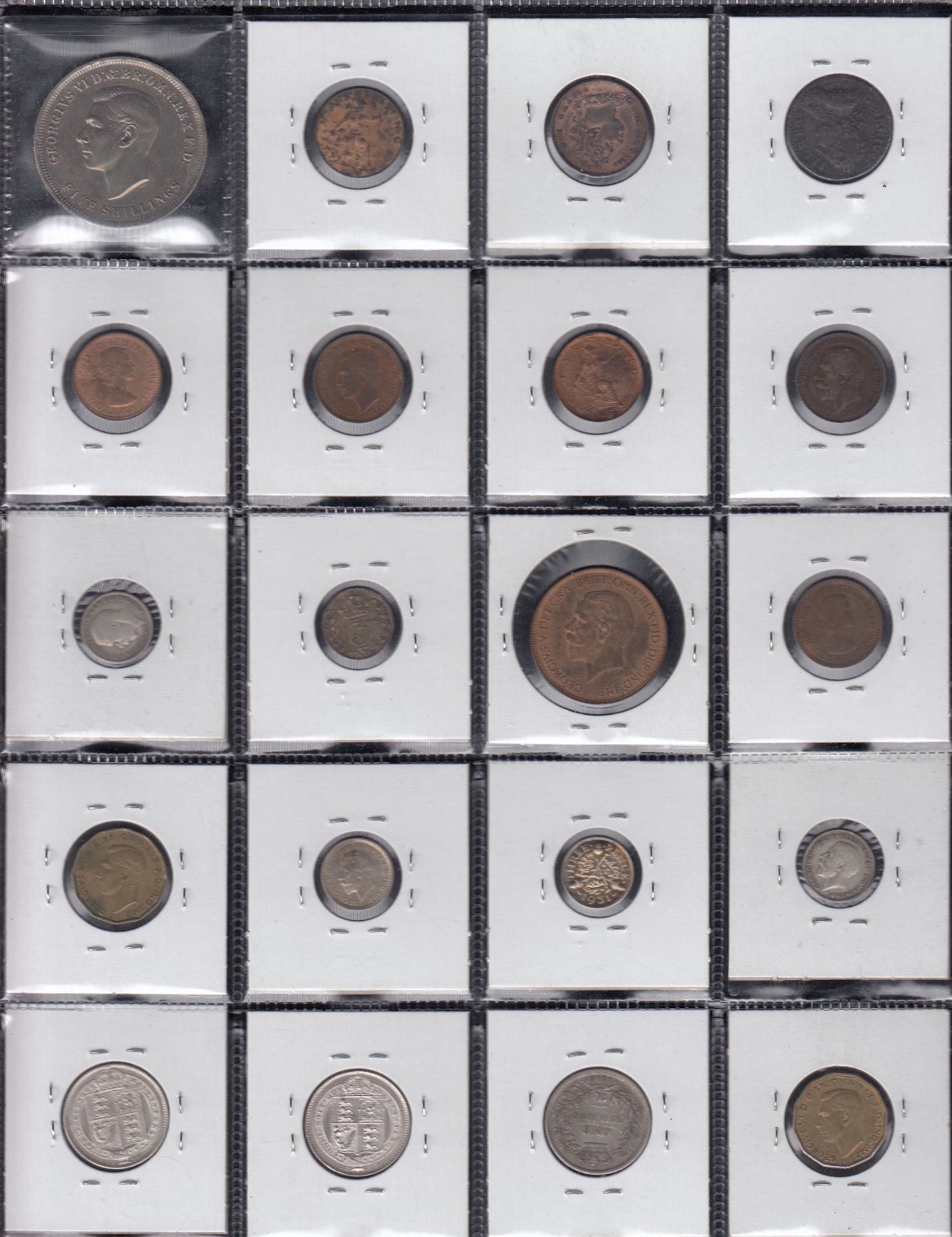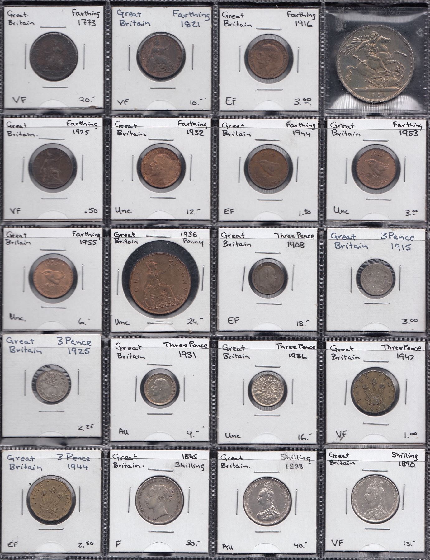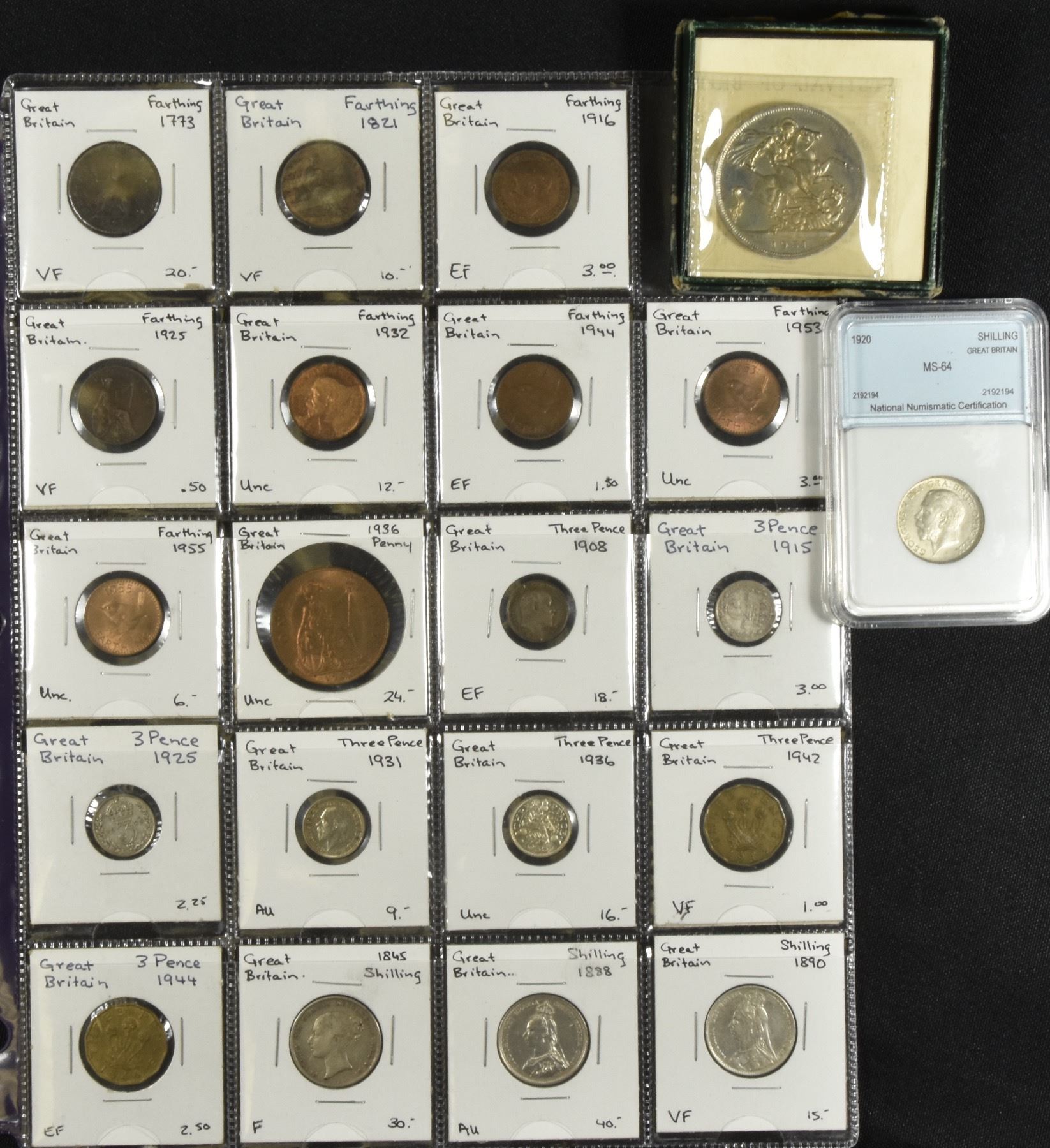 Farthings 1773, 1821, 1916, 1925, 1932, 1944, 1953, 1955, Penny 1936, Three Pence (silver) 1908, 1915,1925, 1931, 1936, Three Pence (brass) 1942, 1944, Shilling 1845, 1888, 1890, 1920, Crown 1951 Fine - Unc. 21 pcs.