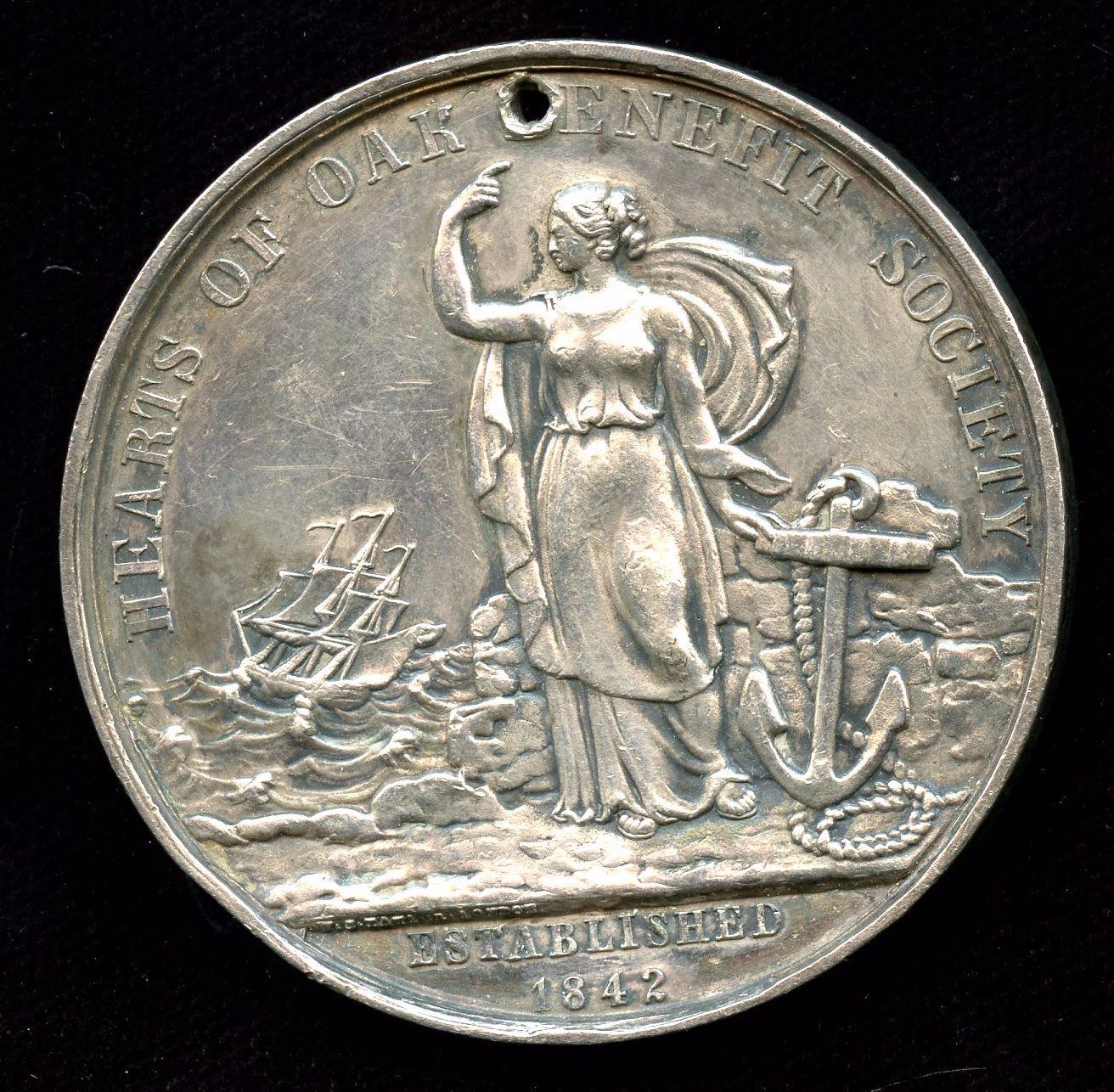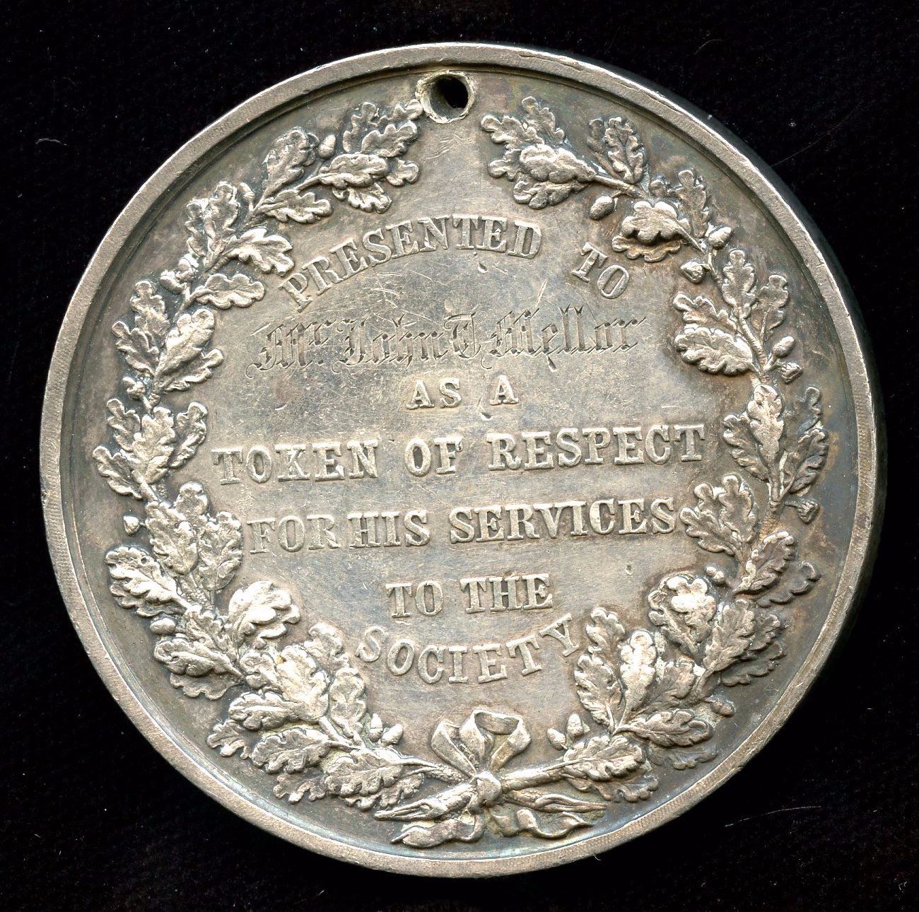 Hearts of Oak silver medal, awarded to Mr. John D. Mellor, 57.0 gms, this Society was organized in 1842 to protect members against distress through sickness. Scarce.