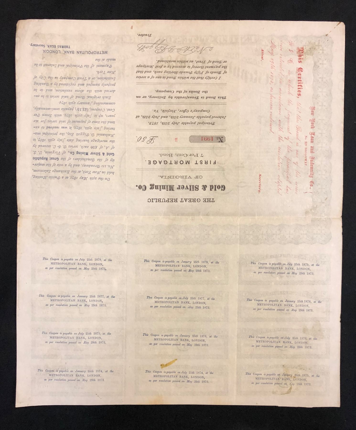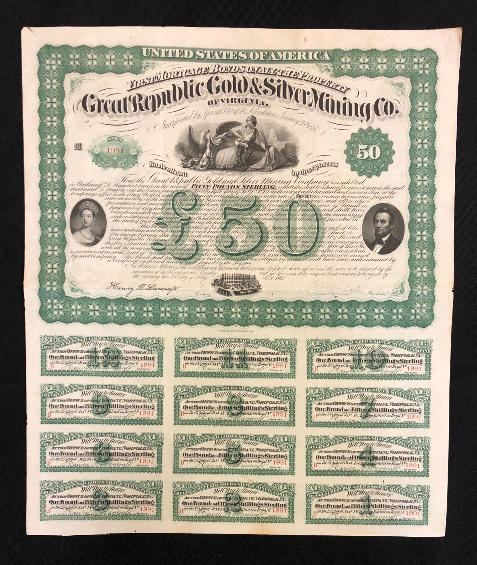 Great Republic Gold & Silver Mining Co. of Virginia, First Mortgage Bond for £50, all 12 coupons still attached. Four vignettes including Queen Victoria (Chalon portrait) and Abraham Lincoln, Continental B. N. Co. imprint. A pretty document, suitable for framing.