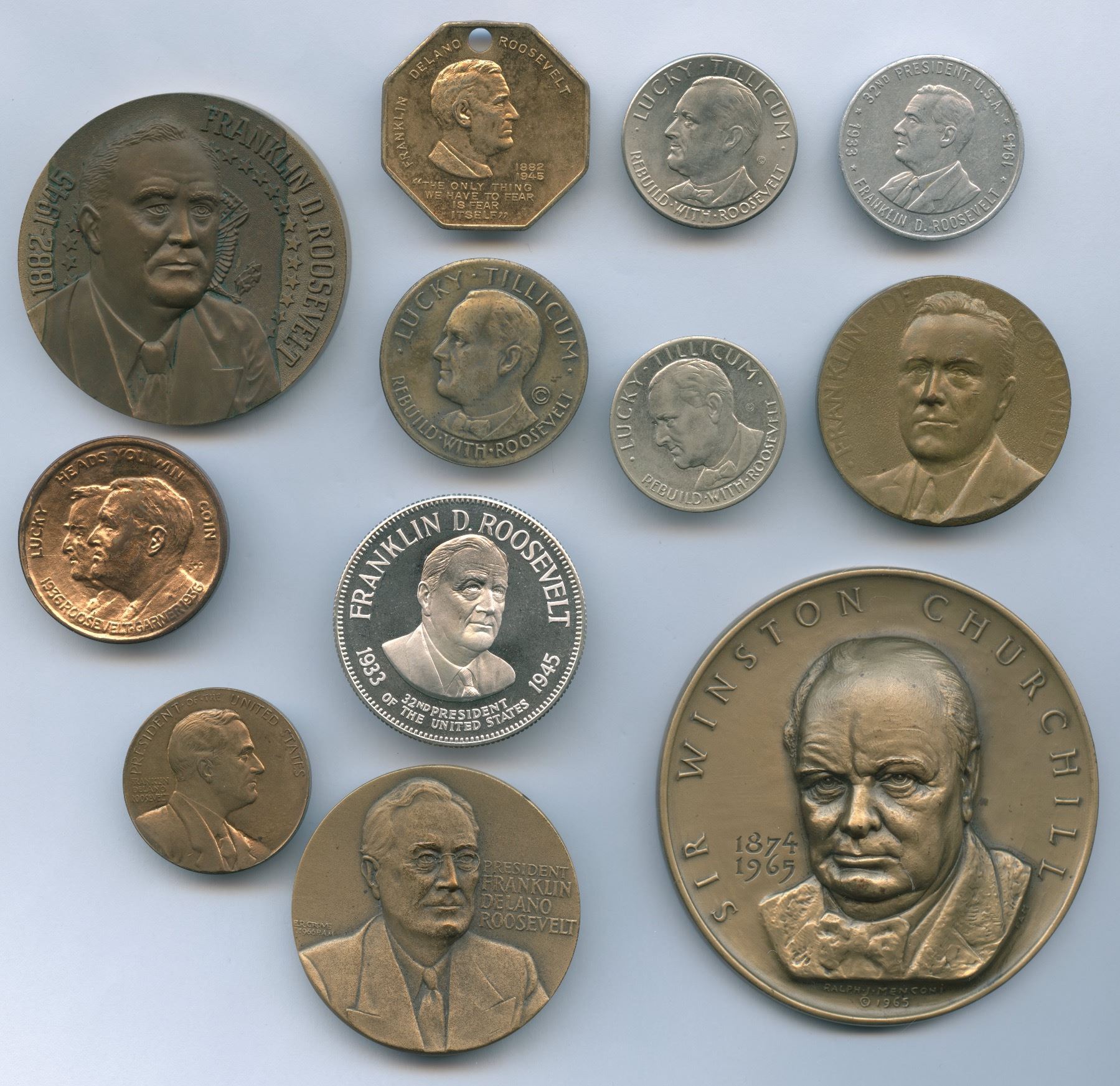 1.) FDR Commemorative Medal by Elliot Inberg in original case. 51mm. 2.) 1936 FDR 2nd Captain medal in brass. 32.5mm. 3.) 1937 FDR Re-elected medal in brass. 28.73mm. 4.) FDR New Deal medalet in aluminum 29mm. 5.) FDR Little White House hexagonal medal in brass. 6.) 1933 FDR Luckly Tillicum medal in brass. 32mm. 7.) Pair of FDR Lucky Tillicum Prosperity medal in nickel. 27.5mm. 8.) FDR Attack on Pearl Harbour medal in bronze by MACO. 44.4mm. 9.) 1933 FDR Courageous Leadership medal in bronze 38mm. 10.) 1965 Winston Churchill medal in bronze by MACO. 70mm. 11.) 1970 FDR Medal .925 Silver medal by Franklin Mint. 39mm. 12 pcs.
