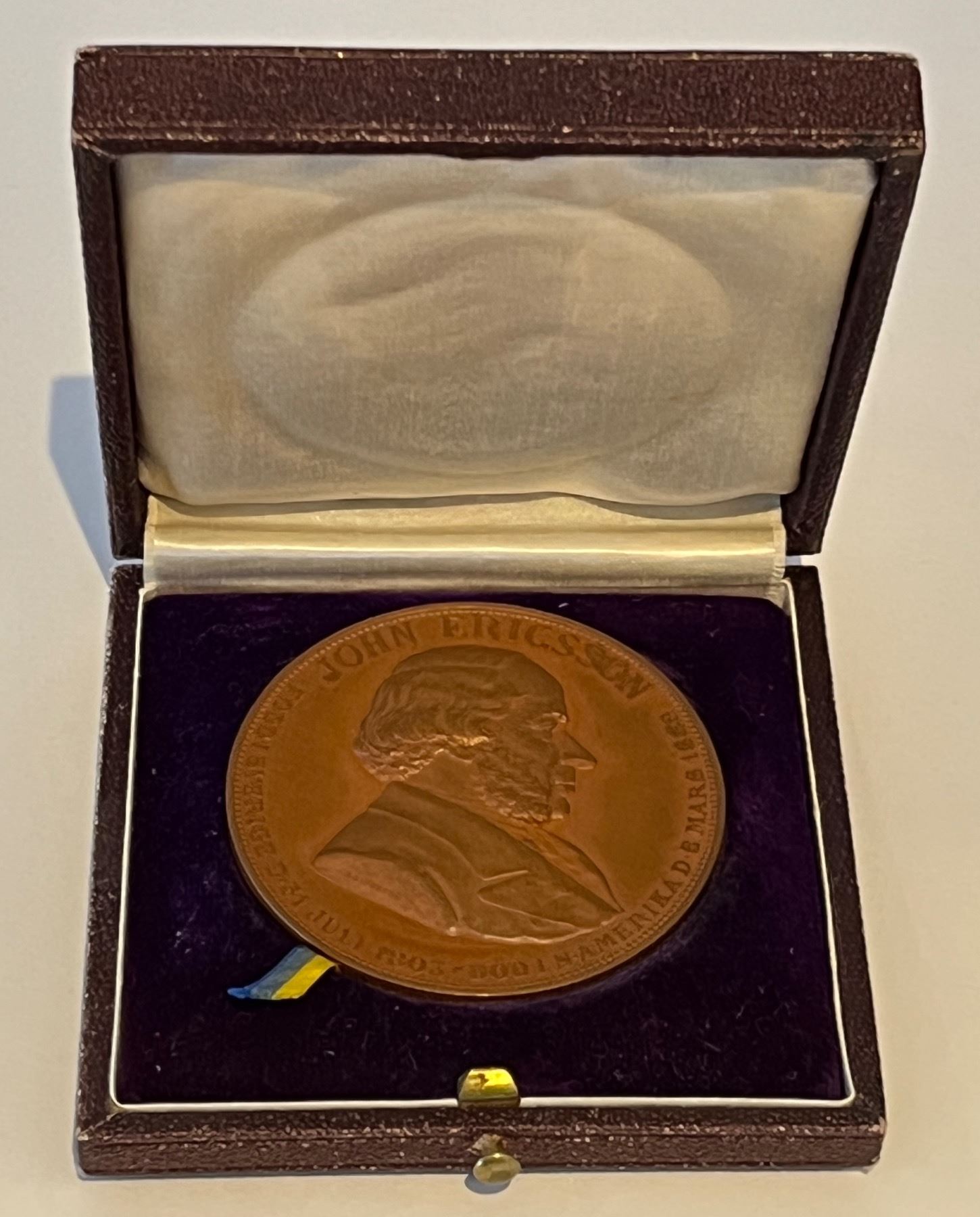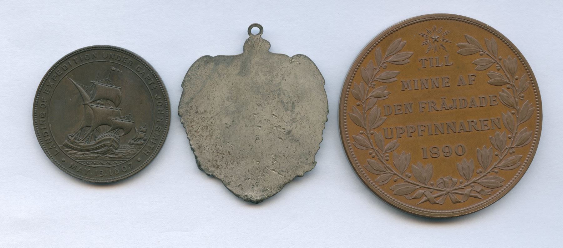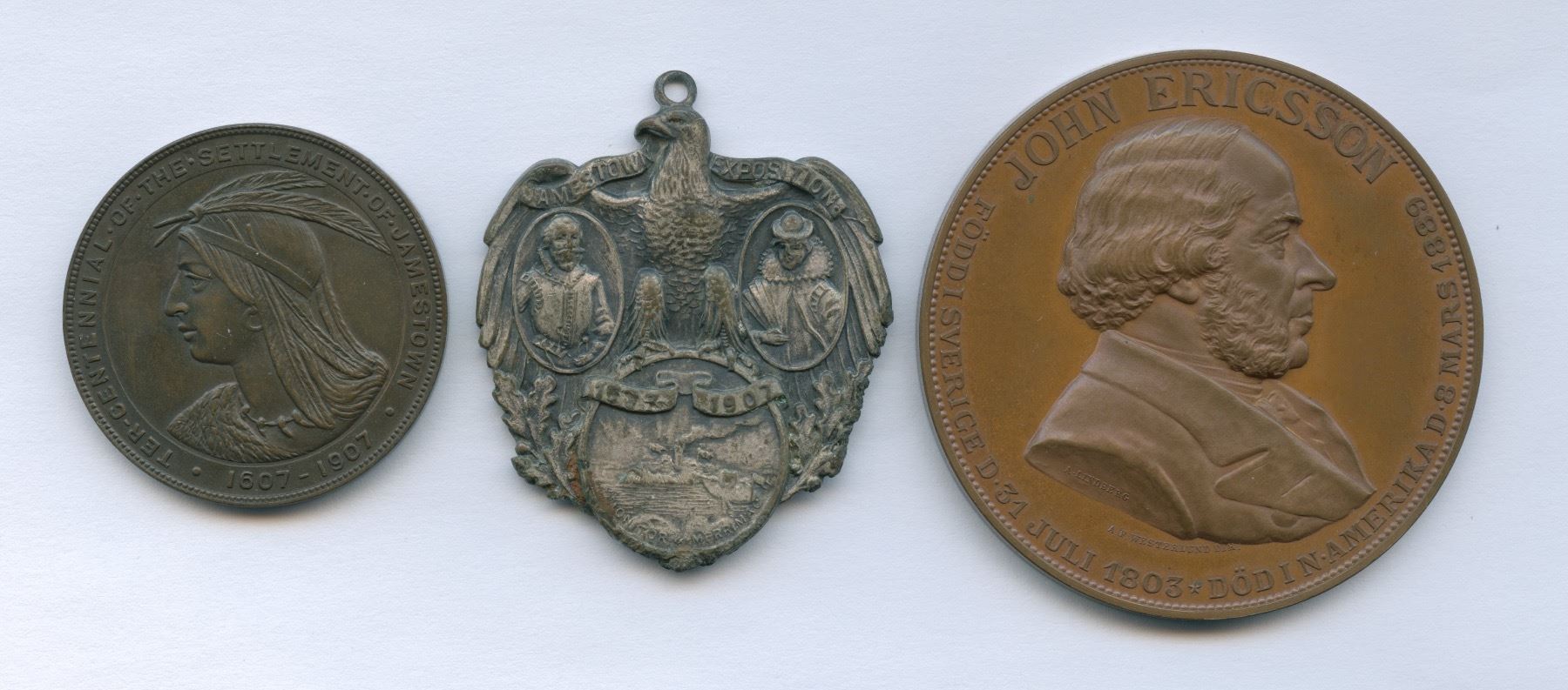 Includes: 1.) 1607-1907 Jamestown Tercentennial Expo/John Smith & Pocahontas, nickel plated bronze, irregular heart shape with loop at top. 2.) 1607-1907 Jamestown Tercentennial Expo medal in bronze, 34mm, HK-346; 3.) 1890 John Ericsson Memorial Medal, produced by A.F. Westerlund, Sweden, bronze 50mm, in impressive original case. 3 pcs.