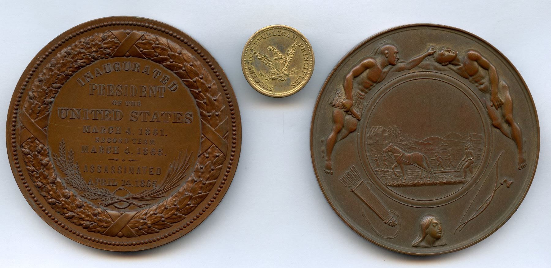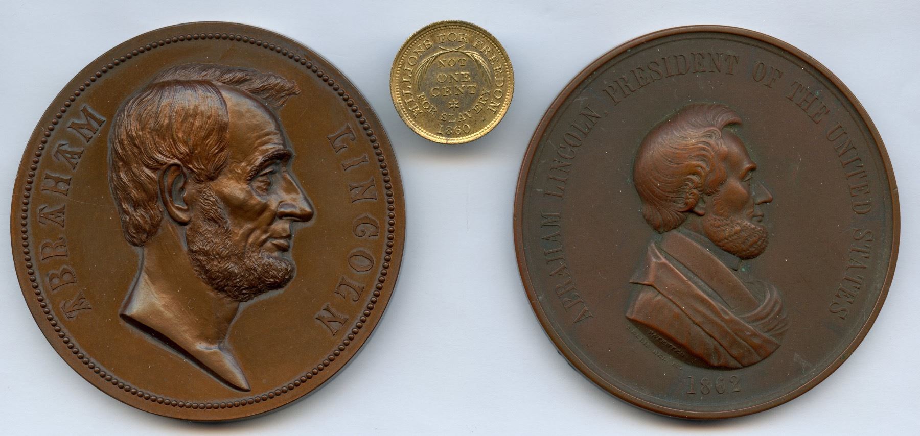 1.) 1860 Abraham Lincoln, Millions for Freedom. Brass, 24mm. 2.) Lincoln Presidential Medal by George T. Morgan. Copper, bronzed, 77mm. 3.) 1862 Abraham Lincoln Indian Peace Medal, bronze, 77mm. 3 pcs.