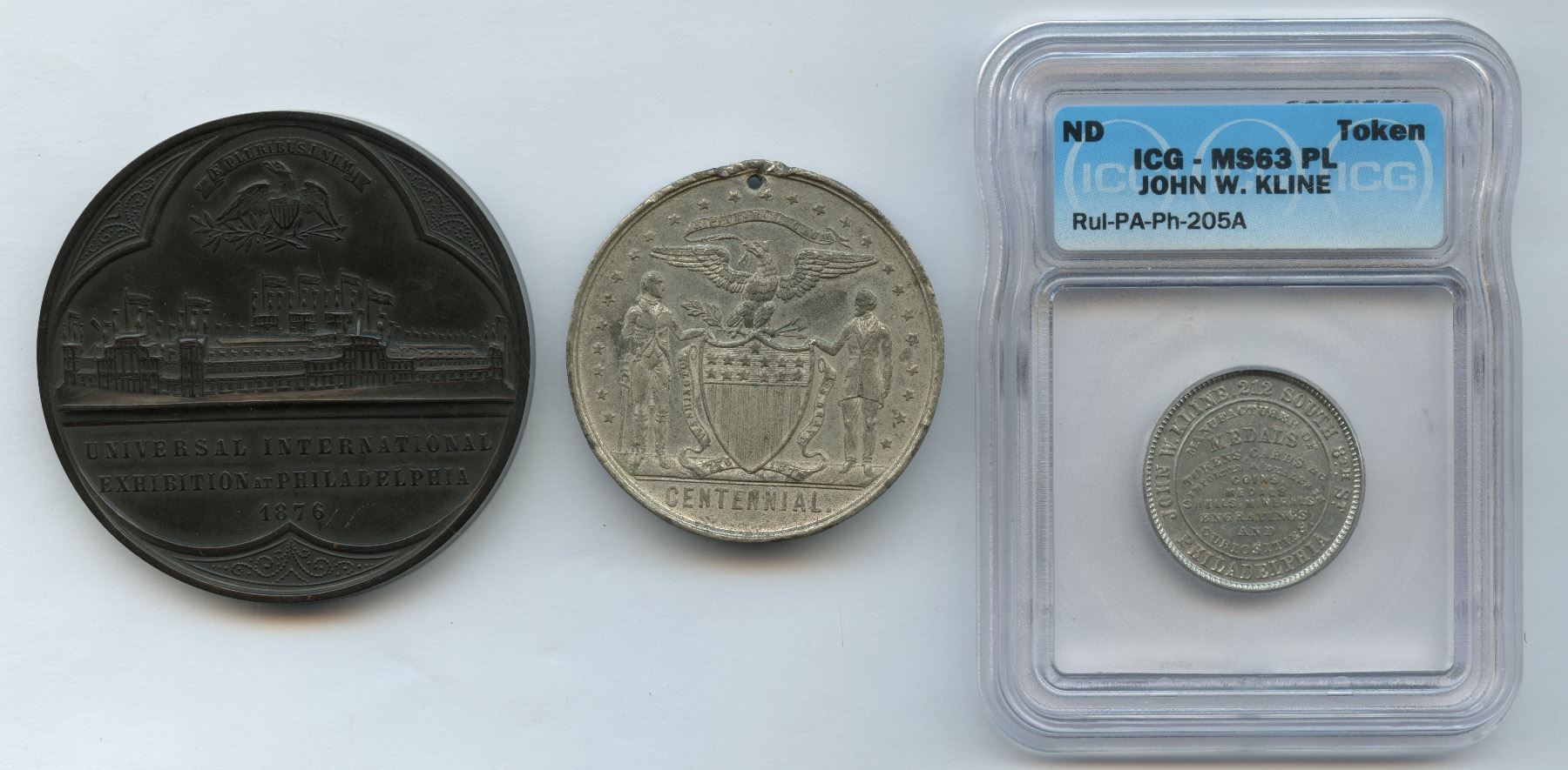 1.) 1876 Universal International Exhibition at Philadelphia / Hard Rubber & Cane Company, black hard rubber, 54.8mm. 2.) 1876 Centennial International Exhibition, white metal, 42mm. 3.) John W. Kline / Libertas Americana, white metal, 25mm, ICG MS63 PL 3 pcs.