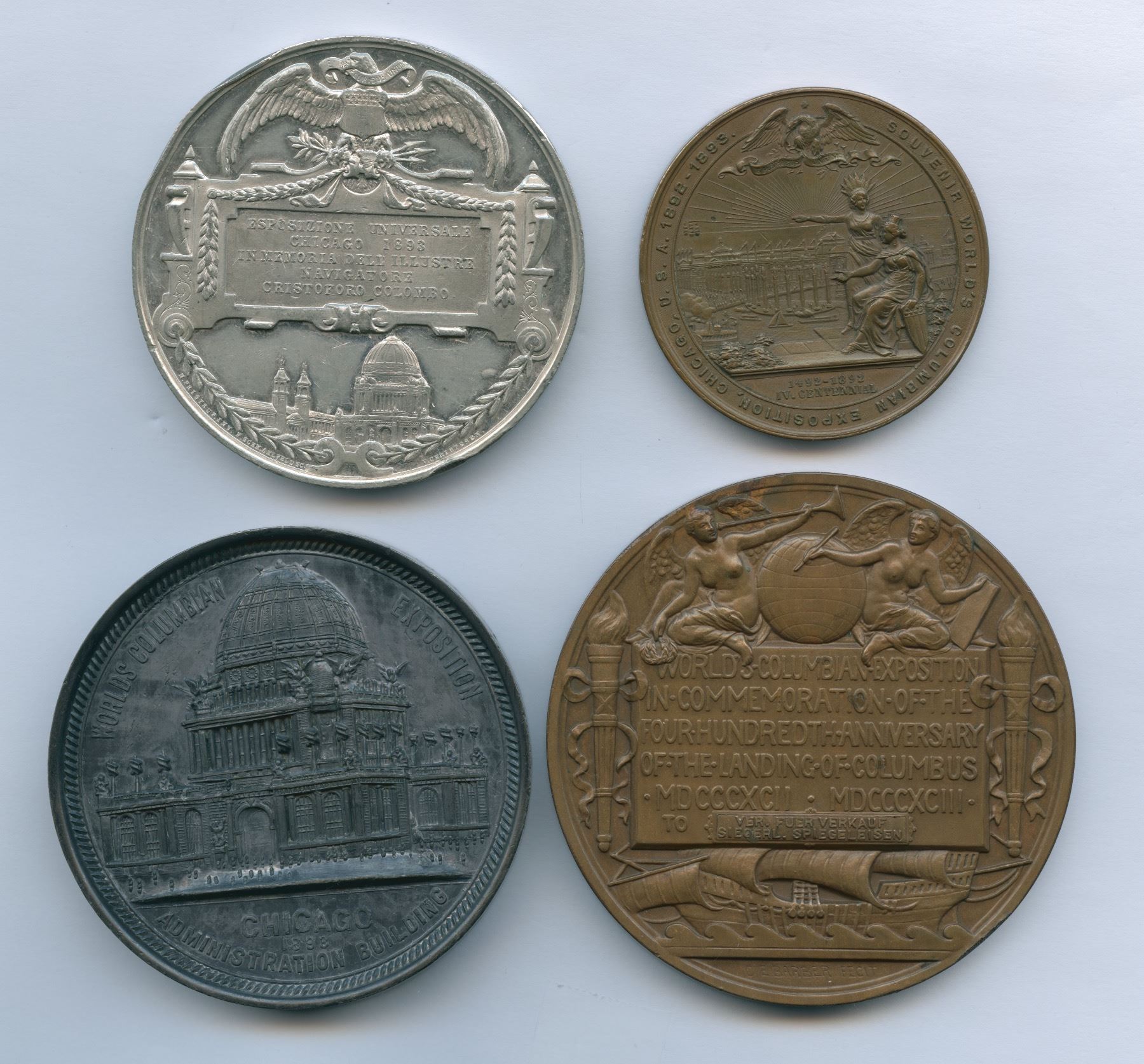 Includes: 1.) 1892-93 World’s Columbian Exposition Danish Medal. Eglit-37 WM, 65mm. 2.) 1892-93 World's Columbian Exposition / Chicago & America. Eglit-55, bronze, 51mm. 3.) 1893 Columbian Exposition / Administration Building. Eglit-135, Pot medal (a type of medal containing lead), 69mm, 194 gms. 4.) 1893 Columbian Exposition Official Award Medal by Saint-Gaudens and Barber. Eglit-90. Copper, 76.4mm. 4 pcs.
