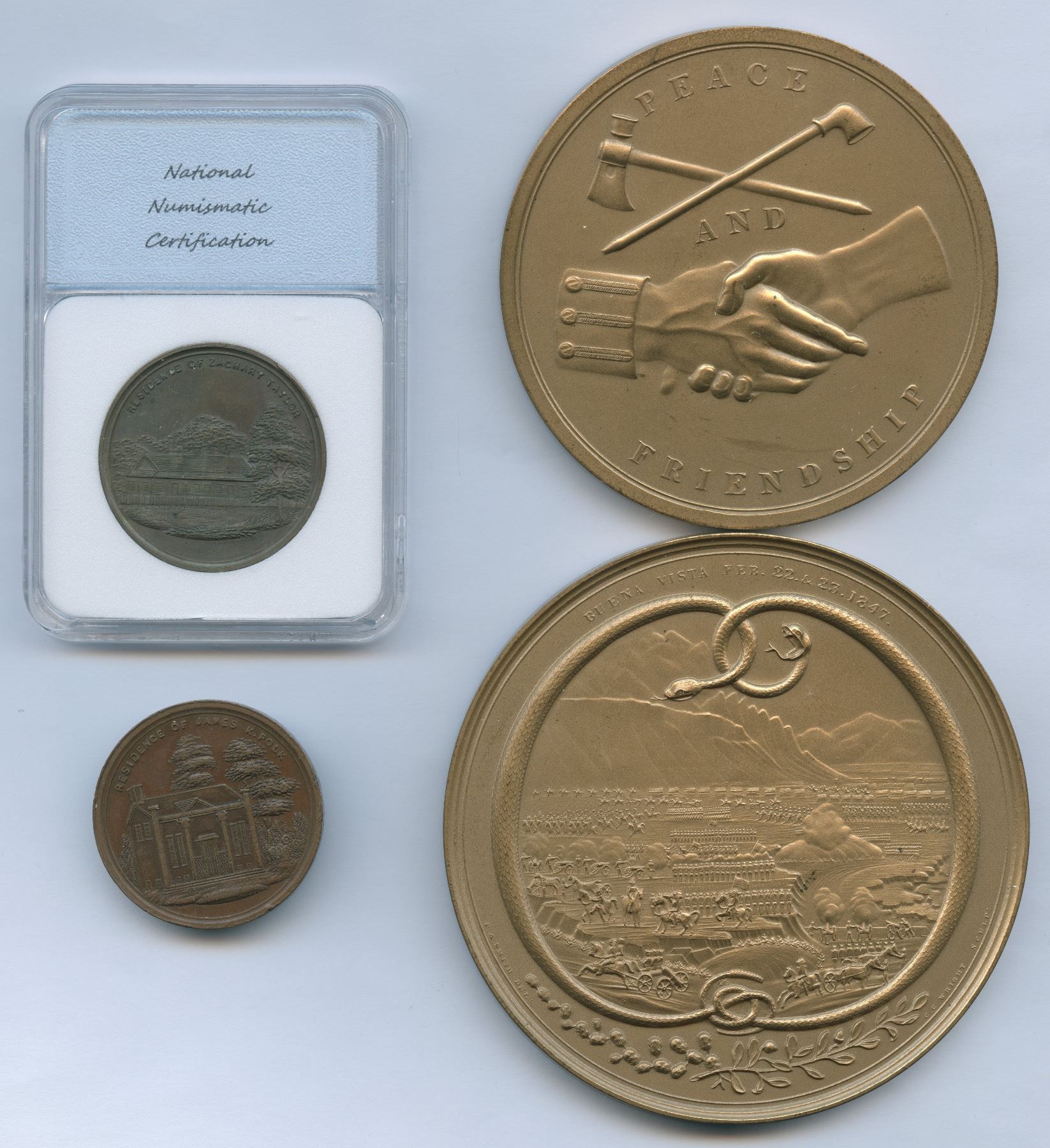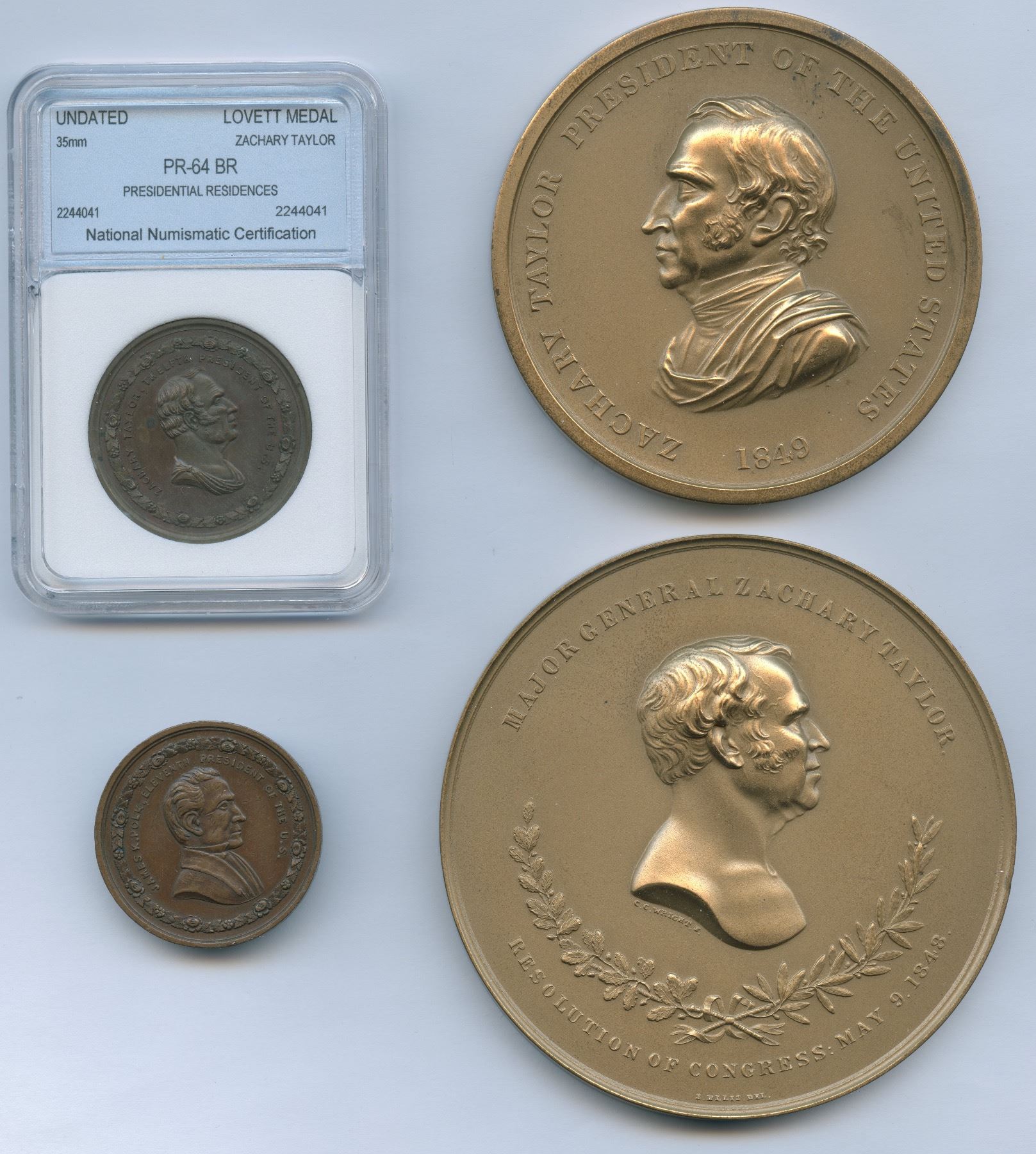 1.) James K. Polk Residence medal by Lovett in bronze. 2.) Zachary Taylor Residence medal by Lovett in bronze. 3.) President Zachary Taylor Indian Peace Medal restrike. 4.) Major General Zachary Taylor Congressional medal restrike. 4 pcs.