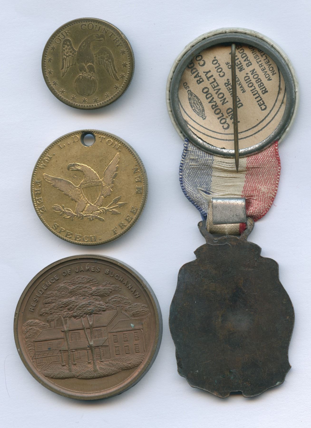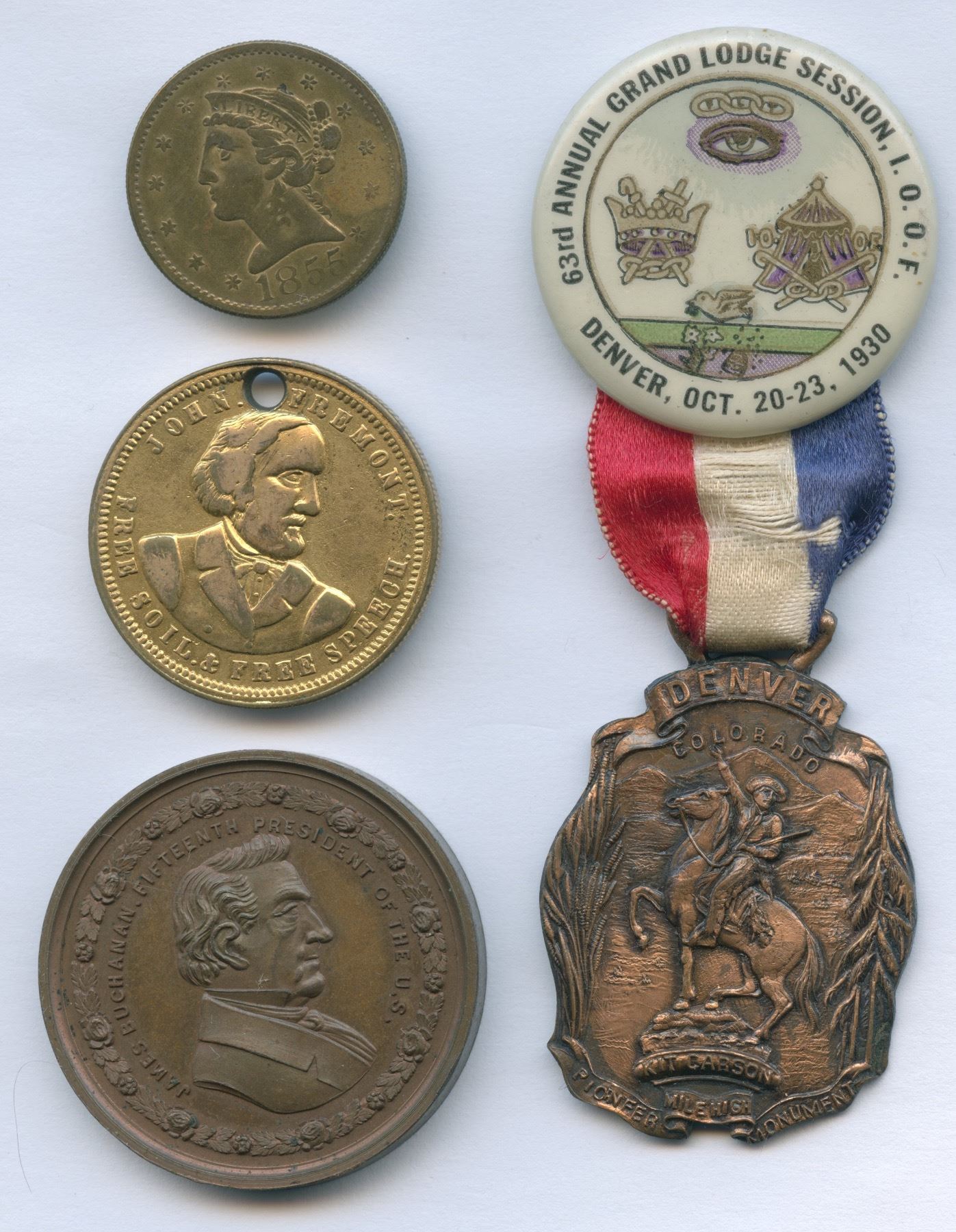 1.) Brass Liberty Head gaming counter dated 1855. 2.) 1930 63rd Annual Grand Lodge Session I.O.O.F Denver. 3.) John Fremont campaign token DeWitt JR-1856-8. 4.) James Buchanan medal by Lovett with 19th century collector envelope. A quality group. 4 pcs.