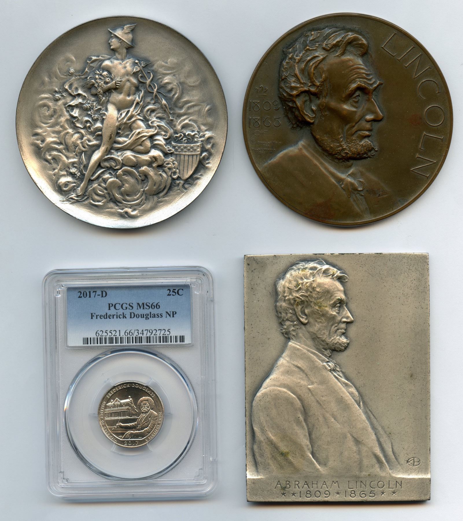 1.) 1928 Lincoln Essay medal awarded to Mabel Robinson. 76mm. 2.) 2017-D Frederick Douglass 25c PCGS MS66. 3.) 1961 Lincoln and Brenner medal by MACO in 999 silver. 75mm. 207.3gms. 4.) Lincoln plaque by MACO in silvered bronze. 4 pcs.