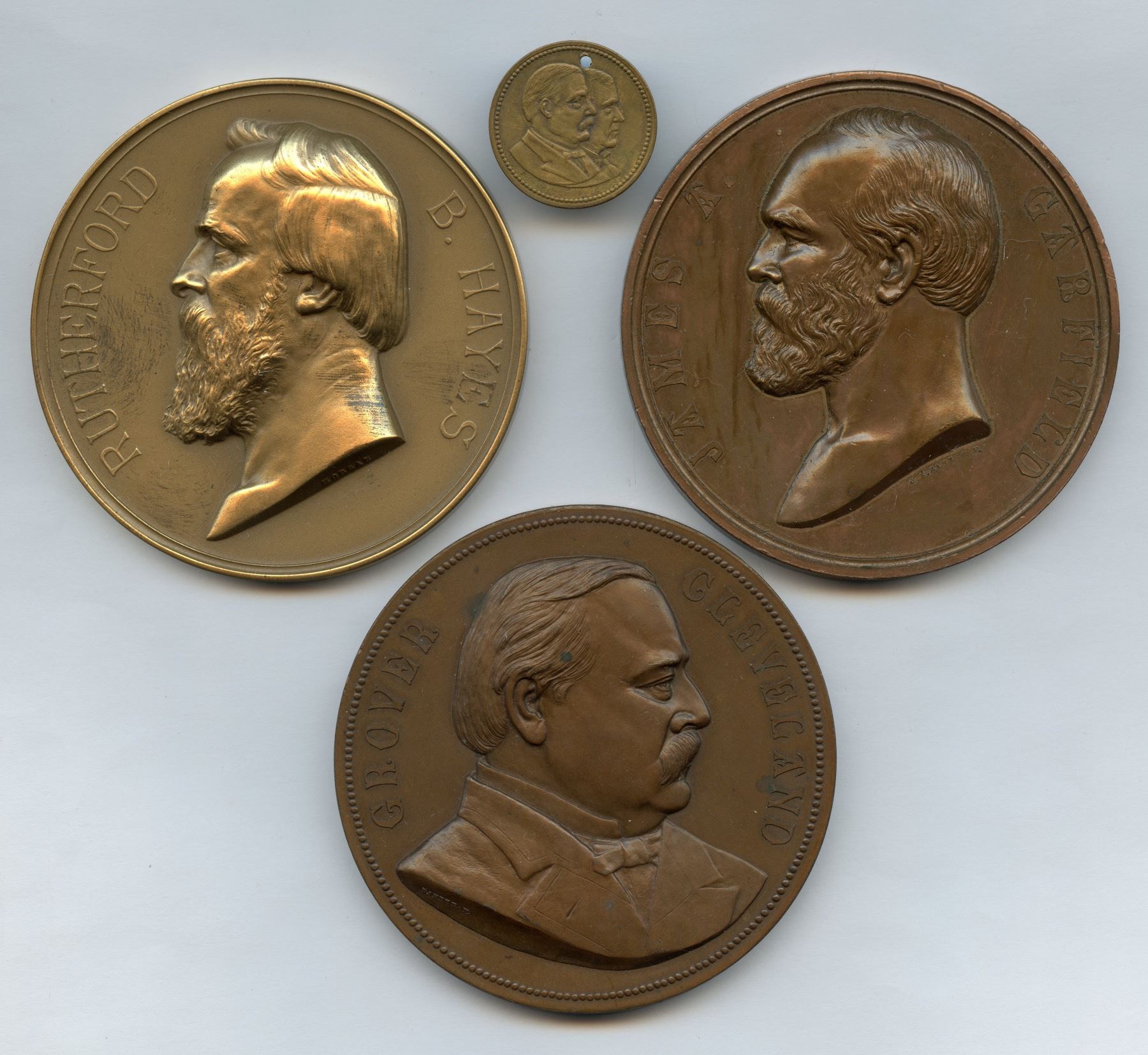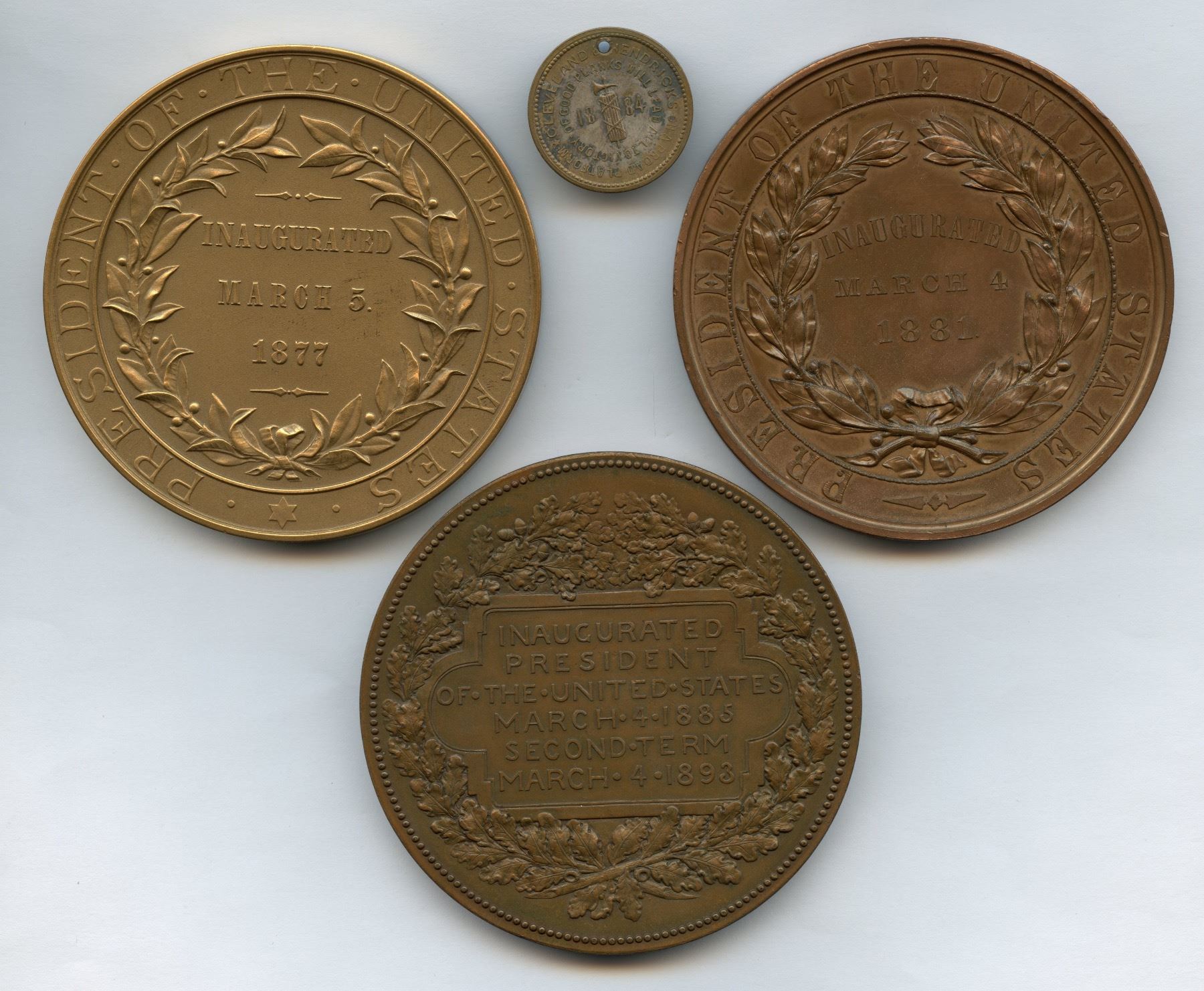 1.) 1877 Rutherford B. Hayes Inauguration medal in bronze. 76mm. 2.) 1884 Cleveland and Hendricks campaign token in silvered brass. 26mm. 3.) 1881 James Garfield Inaugural medal in bronzed copper. 77mm. 4.) Grover Cleveland Inauguration medal by Charles Barber in bronze. 76mm. 4 pcs.
