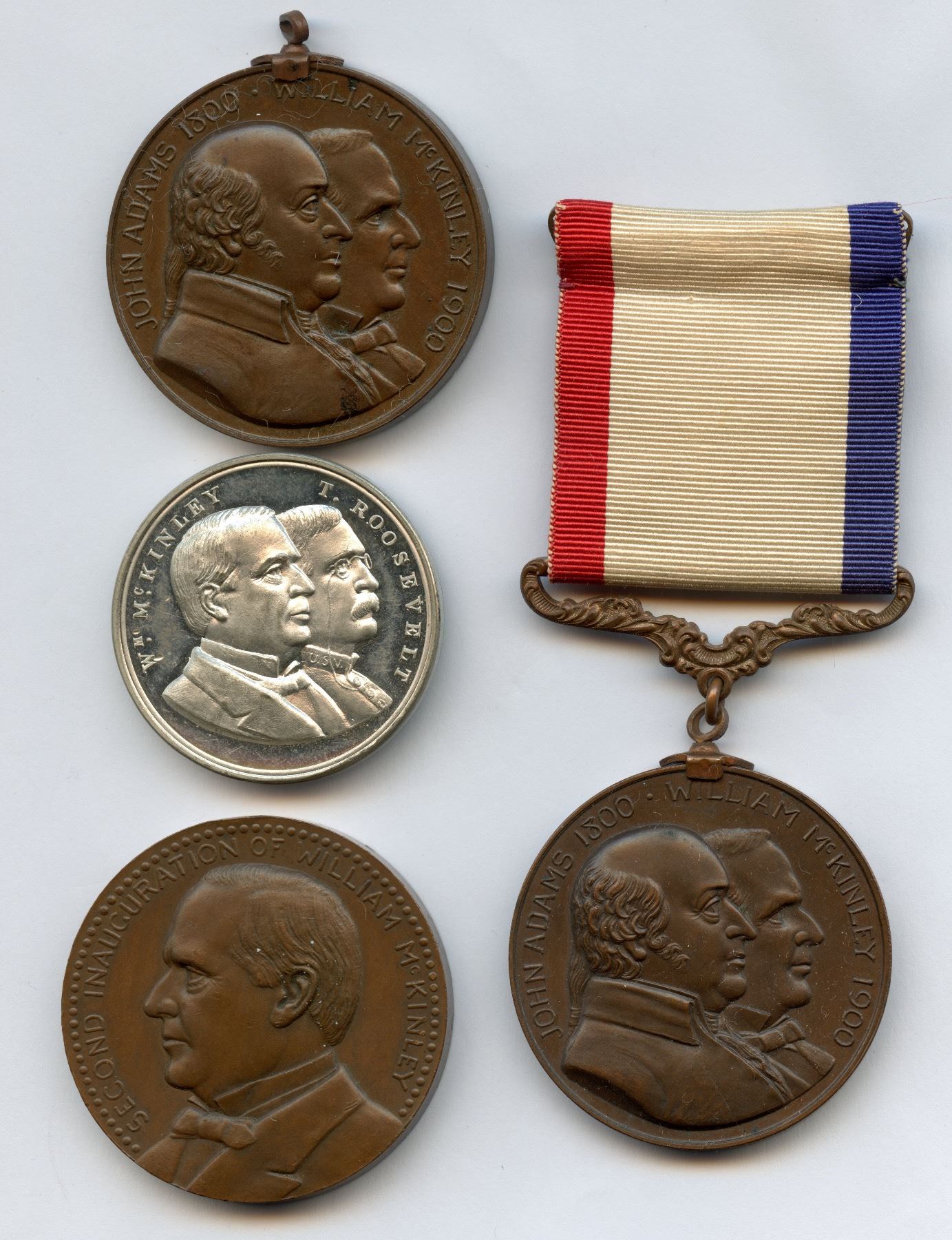 1.) 1901 William McKinley Second Inauguration medal in bronze. 2.) 1900 Centennial of the Establishment of Washington, DC. 3.) As last, with ribbon and pin. 4.) 1901 McKinley-Roosevelt Inaugural medal in white metal by George Morgan. 38mm. 4 pcs.