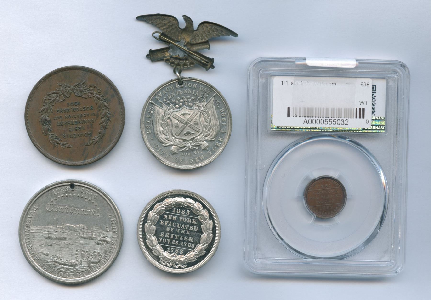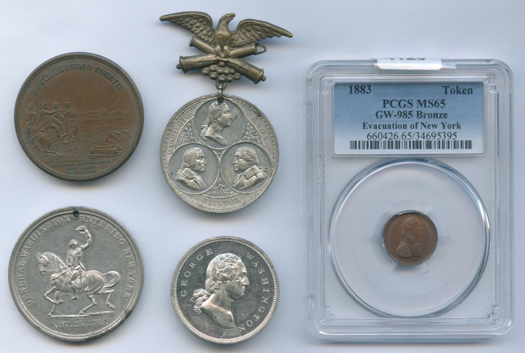 A great quality group including: 1776-1901 125th Anniversary of Evacuation Day Souvenir, copper, 38.1mm, 16.3 gms. HK-131, Baker 52R. 1783-1883 Washington Entering New York, white metal, 40mm, holed at 12:00 as issued, Baker 462A. 3 others are included, inspection is recommended. 5 pcs.