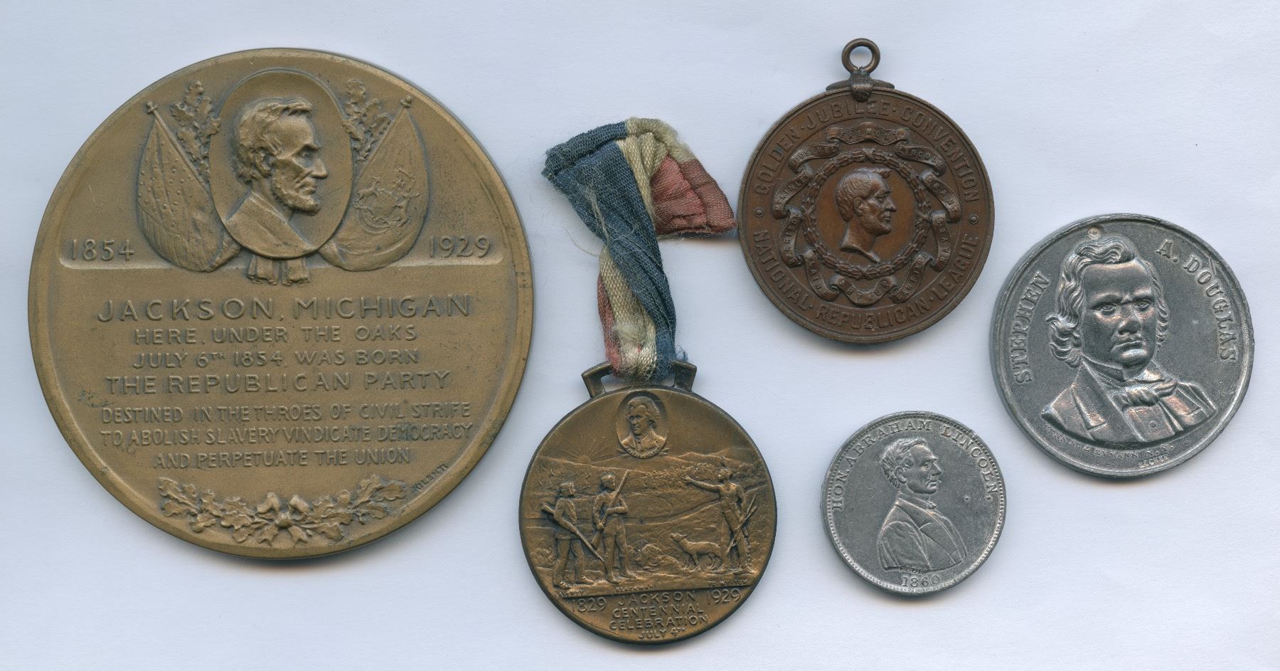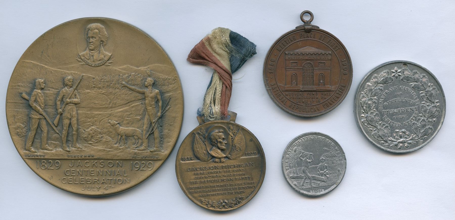 1.) 1929 Jackson, Michigan centennial medal in bronze. 76mm. 2.) Lincoln rail splitter medal in white metal. 28mm. Becker restrike. Sullivan AL-1860-41. 3.) 1860 Stephen Douglas medal in white metal. 41mm. Becker restrike. Sullivan SD-1860-1. 4.) 1929 Jackson centennial medal with ribbon in bronze. 38mm. Cunningham 30-1570Bz. 5.) 1906 Golden Jubilee Republican Convention medal in copper-plated lead. 38mm. King-452. 5 pcs.