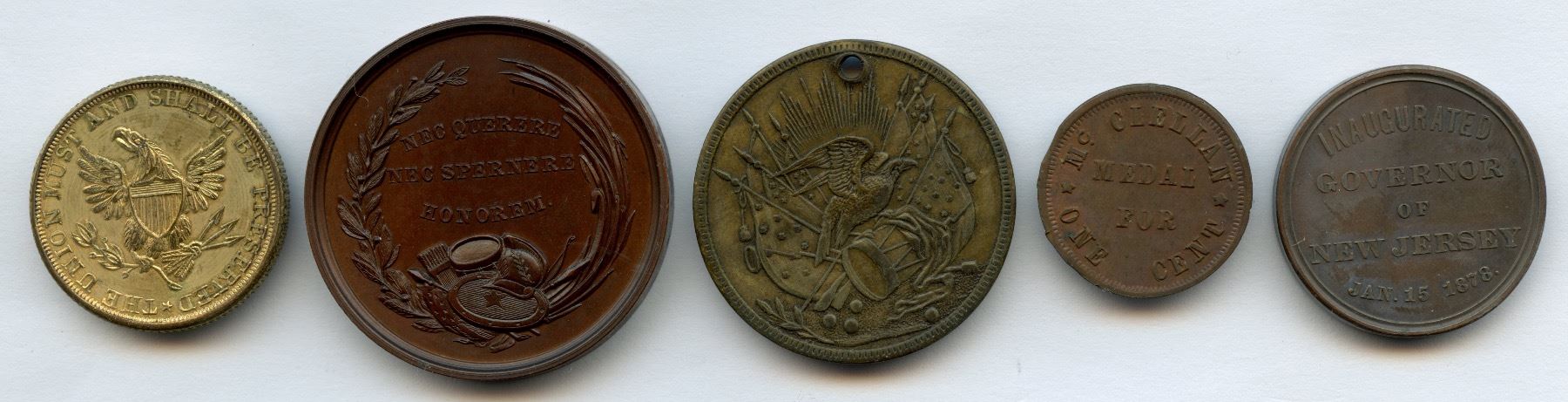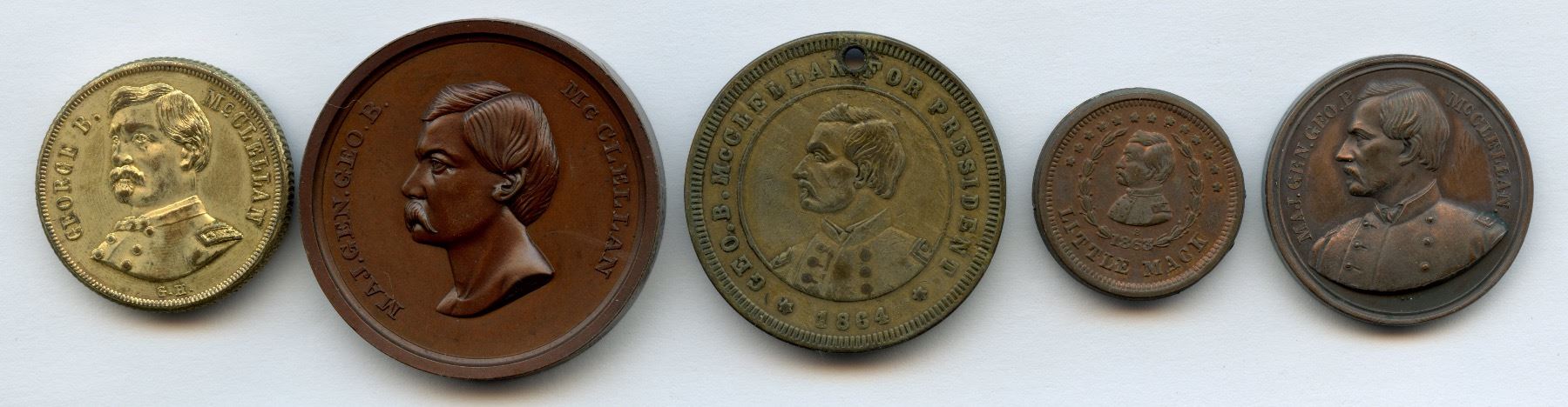 1.) 1864 George McClellan token in brass. 25mm. 2.) McClellan campaign medal in bronzed copper. 33.5mm. Julian PE-19. 3.) McClellan campaign medal in brass. 31mm. 4.) McClellan Little Mack token in copper. 20mm. Fuld 140/394a. 5.) 1878 McClellan Governor of New Jersey Inaugural medalet in copper. 25.6mm. 5 pcs.