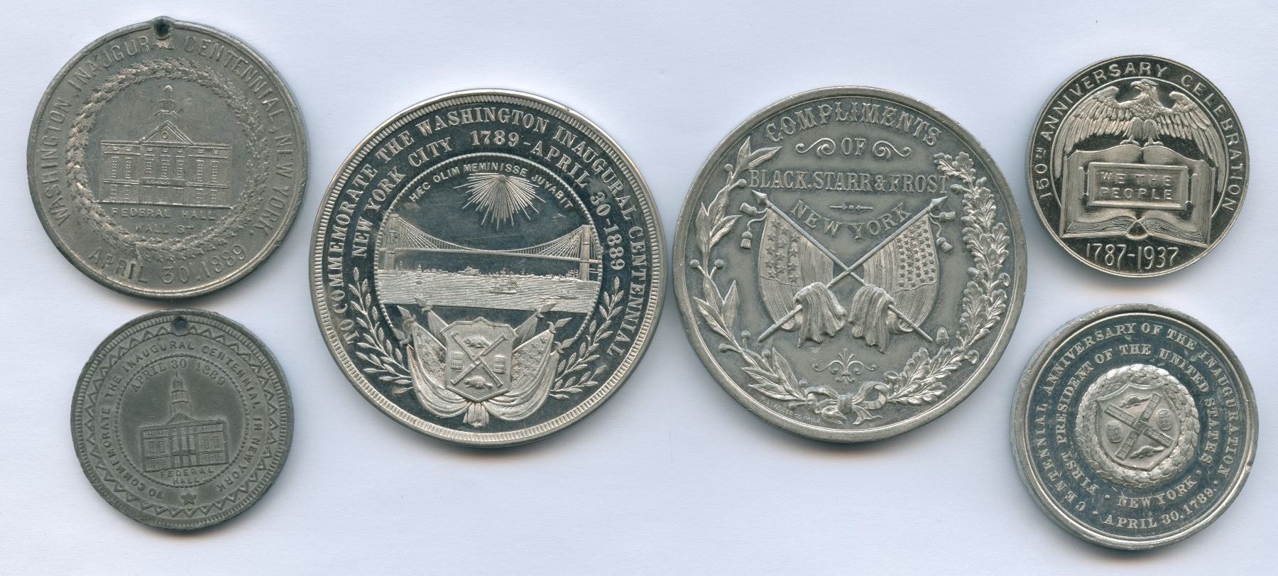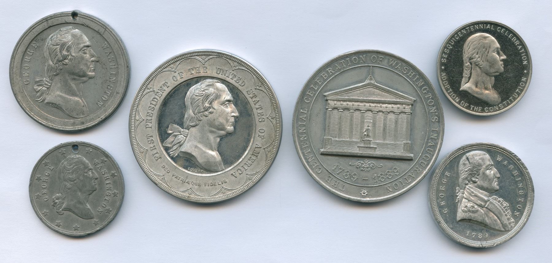 1.) 1889 Washington Inauguration medal in white metal. 35mm. Douglas-43. 2.) 1889 Washington Inauguration medal in white metal. 40mm. Douglas 18. 3.) 1889 Washington Inauguration medal in white metal. 32mm. Douglas-22. 4.) 1889 Washington Inauguration medal in white metal. 51mm. Douglas 7-A. 5.) 1889 Washington Inauguration medal in bronze. 50.6mm. 6.) 1937 U.S. Constitution Sesquicentennial medal in white metal. 32mm. 6 pcs.