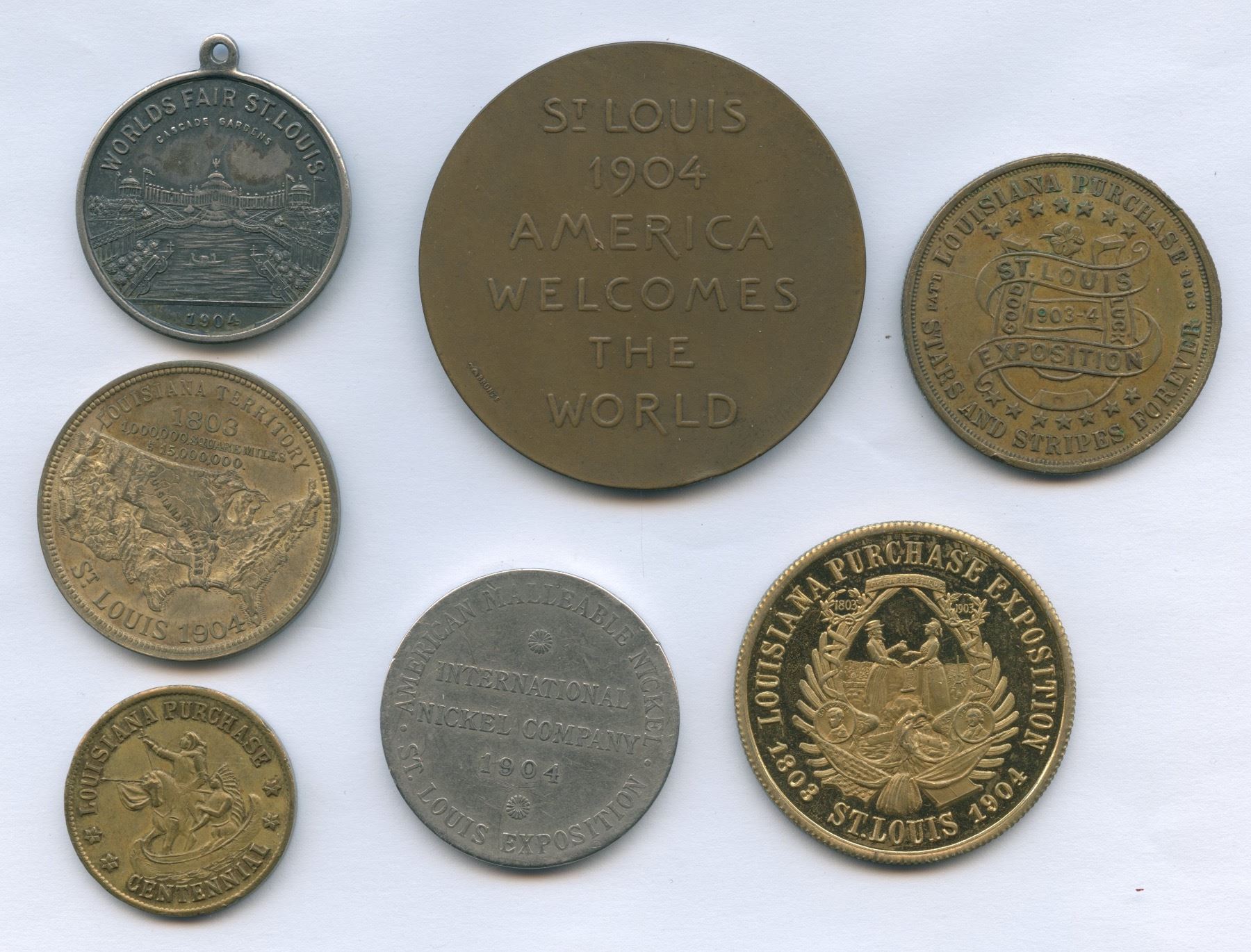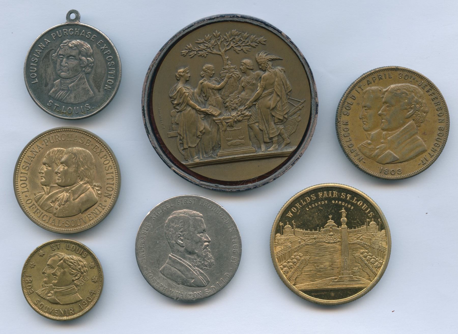1.) 1905 Louisiana Purchase Exposition Thomas Jefferson Cascade Gardens medal in white metal. 31mm. 2.) 1903-04 Louisiana Purchase Exposition Good Luck dollar in gilt brass. 36mm. HK-310, R5. 3.) 1904 St. Louis Exposition INCO dollar. 33mm. HK-323. 4.) 1904 Louisiana Purchase Exposition Cascade Garden medal in brass. 38mm. HK-313A, R6. 5.) 1904 Louisiana Purchase Expiation Bronze medal in original box. 51mm. 6.) 1904 Louisiana Purchase Exposition medal in gilt bronze. 34mm. HK-300, R3. 7.) Louisiana Purchase Exposition Souvenir medal in brass. 26mm. 7 pcs.