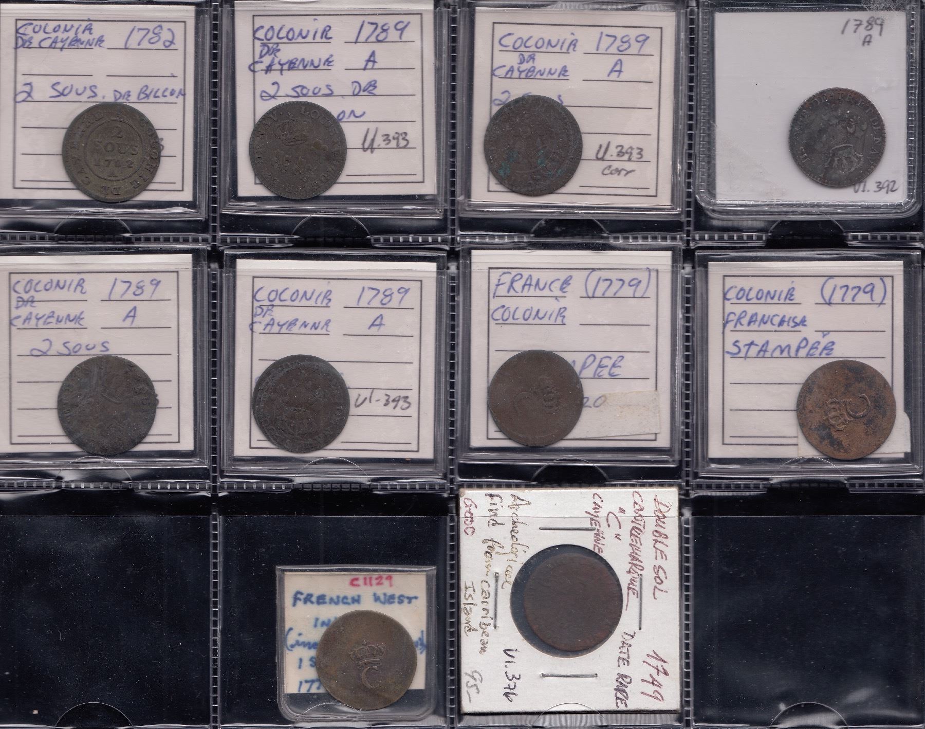 Includes six 2 Sous from Colony of Cayenne: 1782 (1), 1789 (5). Also four stampees of the West Indies: one is a counterfeit of the issue of the 1760s (see Vlack 376); remaining three are countermarks on a blank planchets, circa 1779. Mostly VG-F. 10 Pcs.