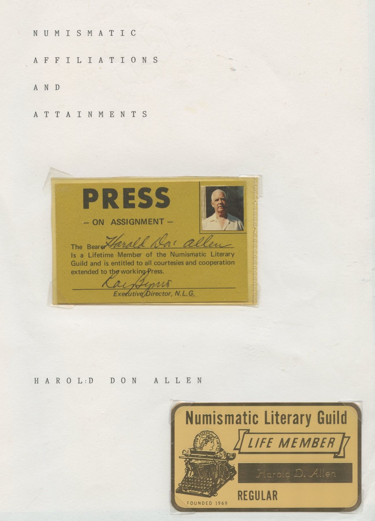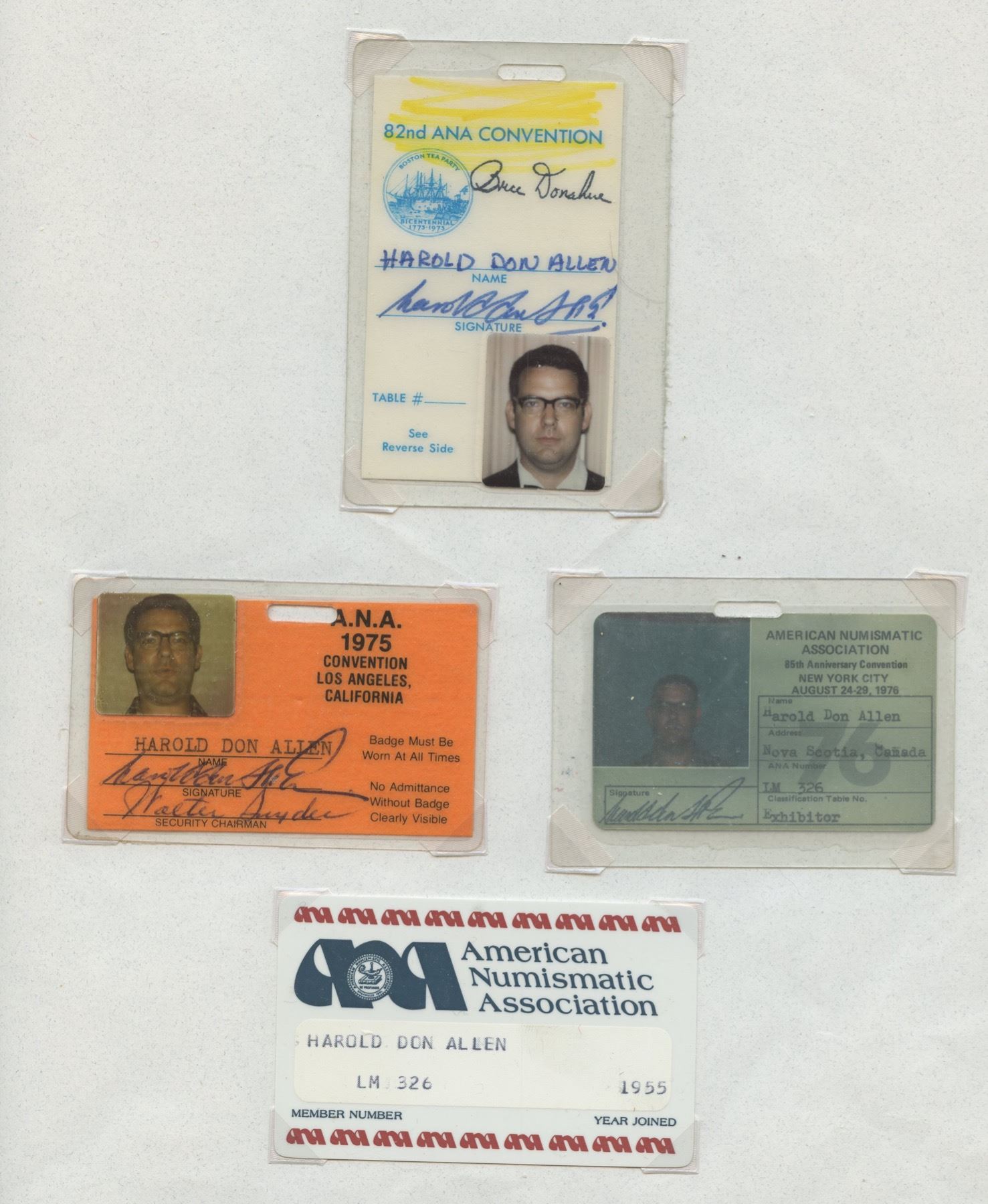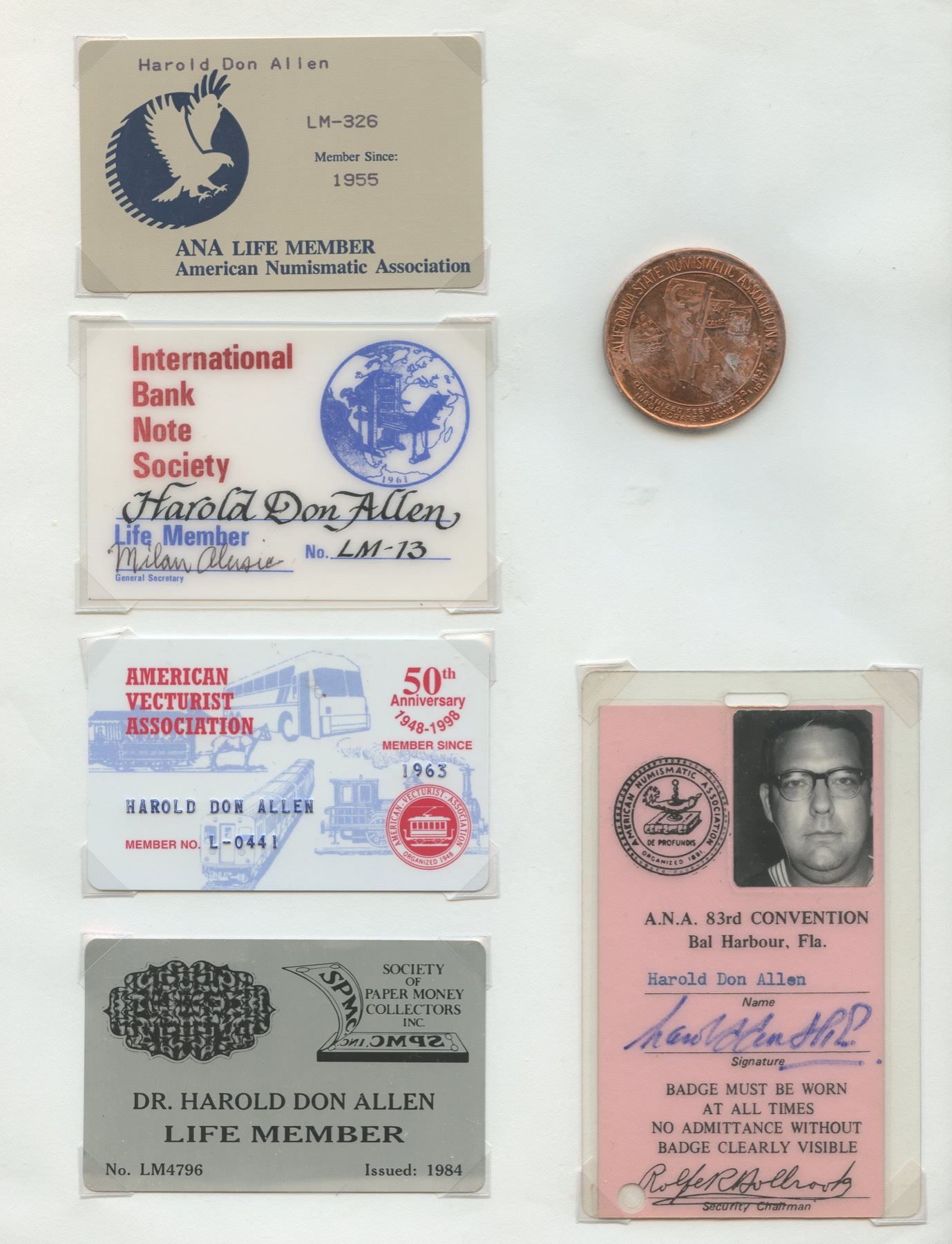 Dr. Allen's 50 year 10 Kt. Gold medal for membership in the American Numismatic Association. It weighs 15.8 grams. Accompanying the medal are numerous organization membership cards.