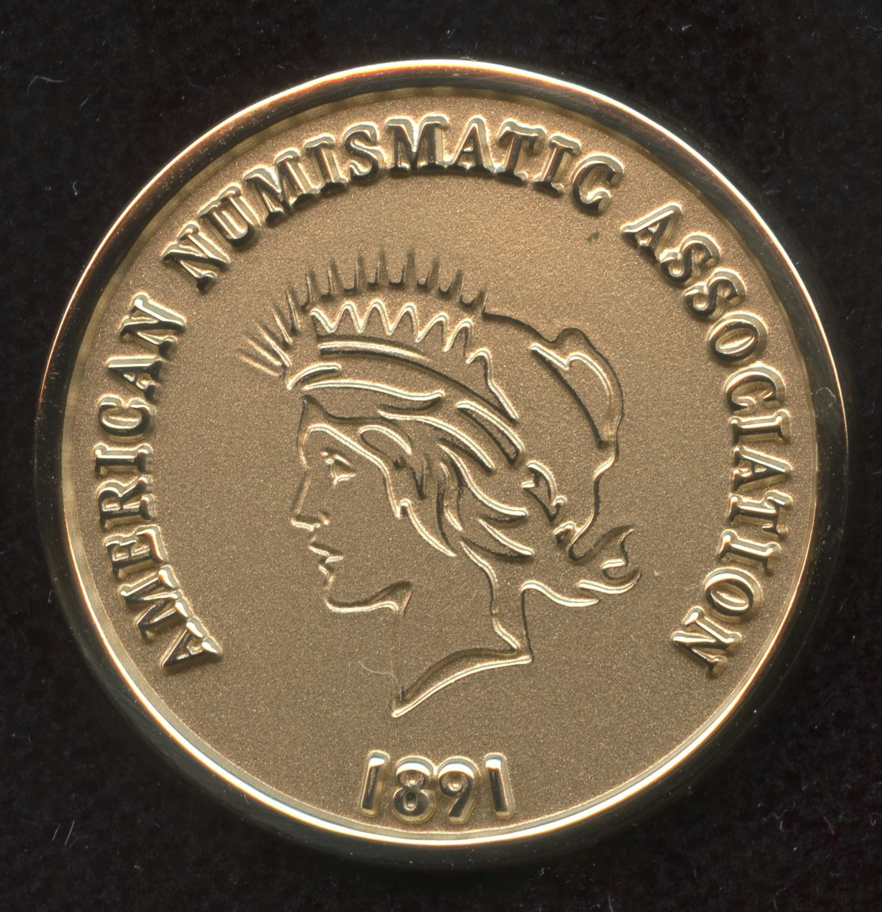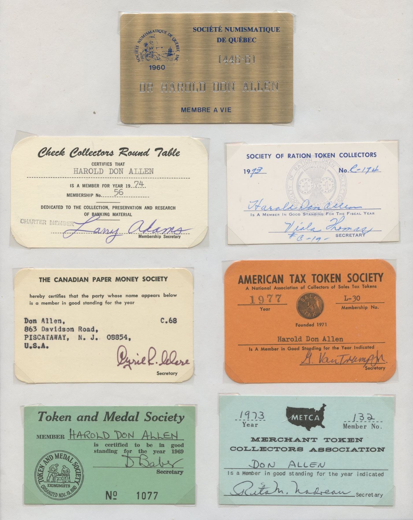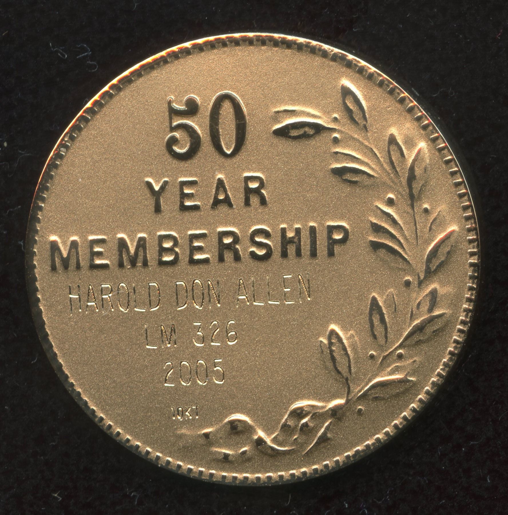 Dr. Allen's 50 year 10 Kt. Gold medal for membership in the American Numismatic Association. It weighs 15.8 grams. Accompanying the medal are numerous organization membership cards.