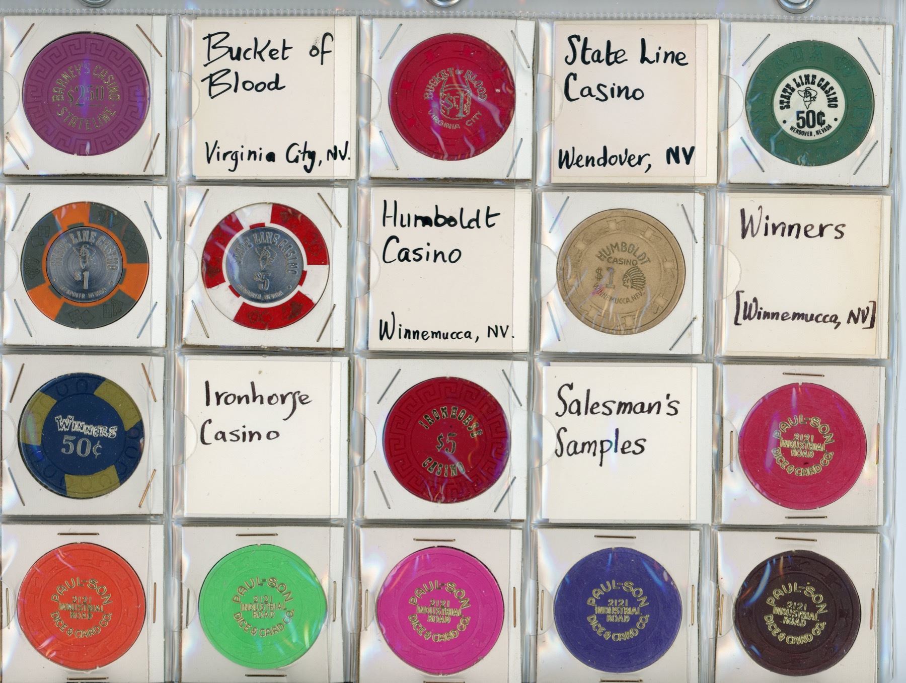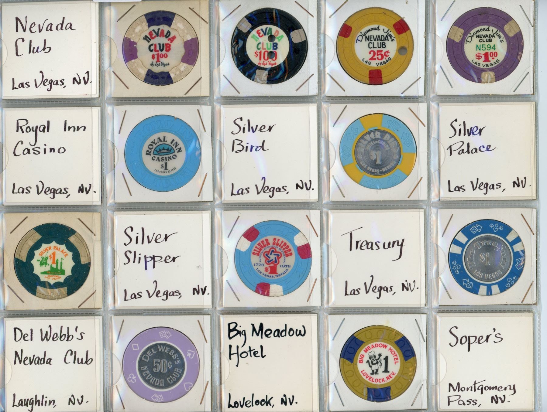 Collection of Vintage Casino Tokens - Nevada Club, Las Vegas, NV; Royal Inn Casino, Las Vegas, NV; Silver Birds, Las Vegas, NV; Silver Palace, Las Vegas, NV; Silver Slipper, Las Vegas, NV; Treasury, Las Vegas, NV; Del Webb’s Nevada Club, Laughlin, NV; Big Meadow Hotel, Lovelock, NV; Soper’s, Montgomery Pass, NV; Silver Nugget, North Las Vega, NV; Comstock Hotel & Casino, Reno, NV; El Inca, Reno, NV; Harolds, Reno, NV; Horseshoe Club, Reno, NV; Mint Club Reno, NV; Overland Hotel, Reno, NV; United Club, Reno, NV; Sparks Silver Club, Sparks, NV; Barney’s Casino, Stateline, NV; Bucket of Blood, Virginia City, NV; State Line Casino, Wenover, NV; Humboldt Casino, Winnemucca, NV; Winners, Winnemucca, NV; Ironhorse Casino; Salesman’s Samples, Paul-Son Dice & Card Co. 35 Pcs