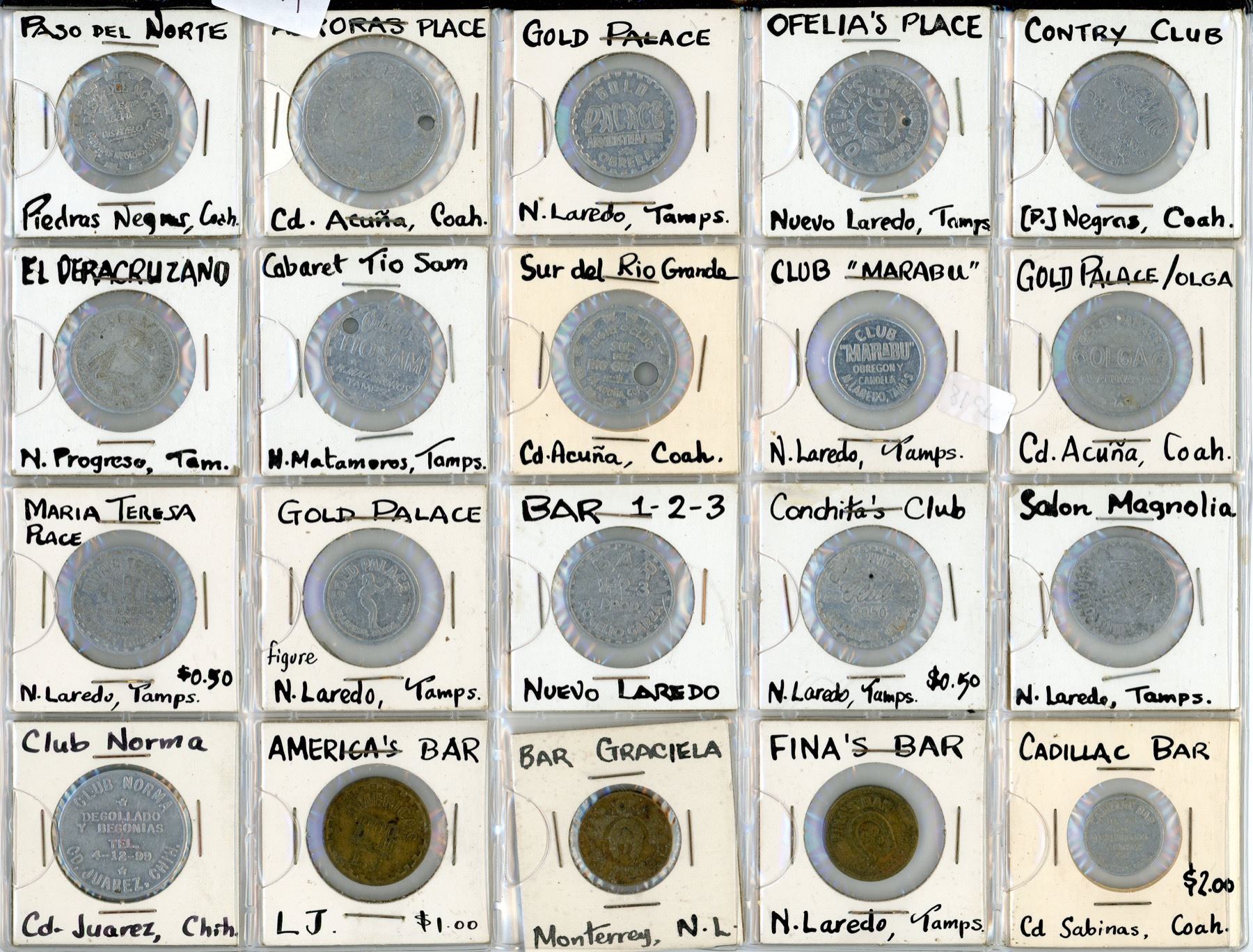Collection of Vintage Casino Tokens - Paso Del Norte, Piedra Negras, Coah; Auroras Place, Cd. Acuna, Coah; Gold Palace, N. Laredo, Tamps; Ofelia’s Place, Nuevo Laredo, Tamps; Contry Club, PJ. Negras, Coah; El Oeracruzano, N. Progreso, Tam; Cabaret Tio Sam, N. Matamoros, Tamps; Sur del Rio Grande, Cd. Acuna, Coah; Club “Marabu”, N. Laredo, Tamps; Gold Palace, Olga, Cd. Acuna, Coah; Maria Teresa Place, N. Laredo, Tamps; Gold Palace, N. Laredo, Tamps; Bar 1-2-3-, Nuevo Laredo; Conchita’s Club, N. Laredo, Tamps; Salon Magnolia, N. Laredo, Tamps; Club Norma, Cd. Juarez, Chih.; America’s Bar, LJ; Bar Graciela, Monterrey, N.L.; Fina’s Bar, N. Laredo, Tamps; Cadillac Bar, Cd Sabinas, Coah. 20 Pcs