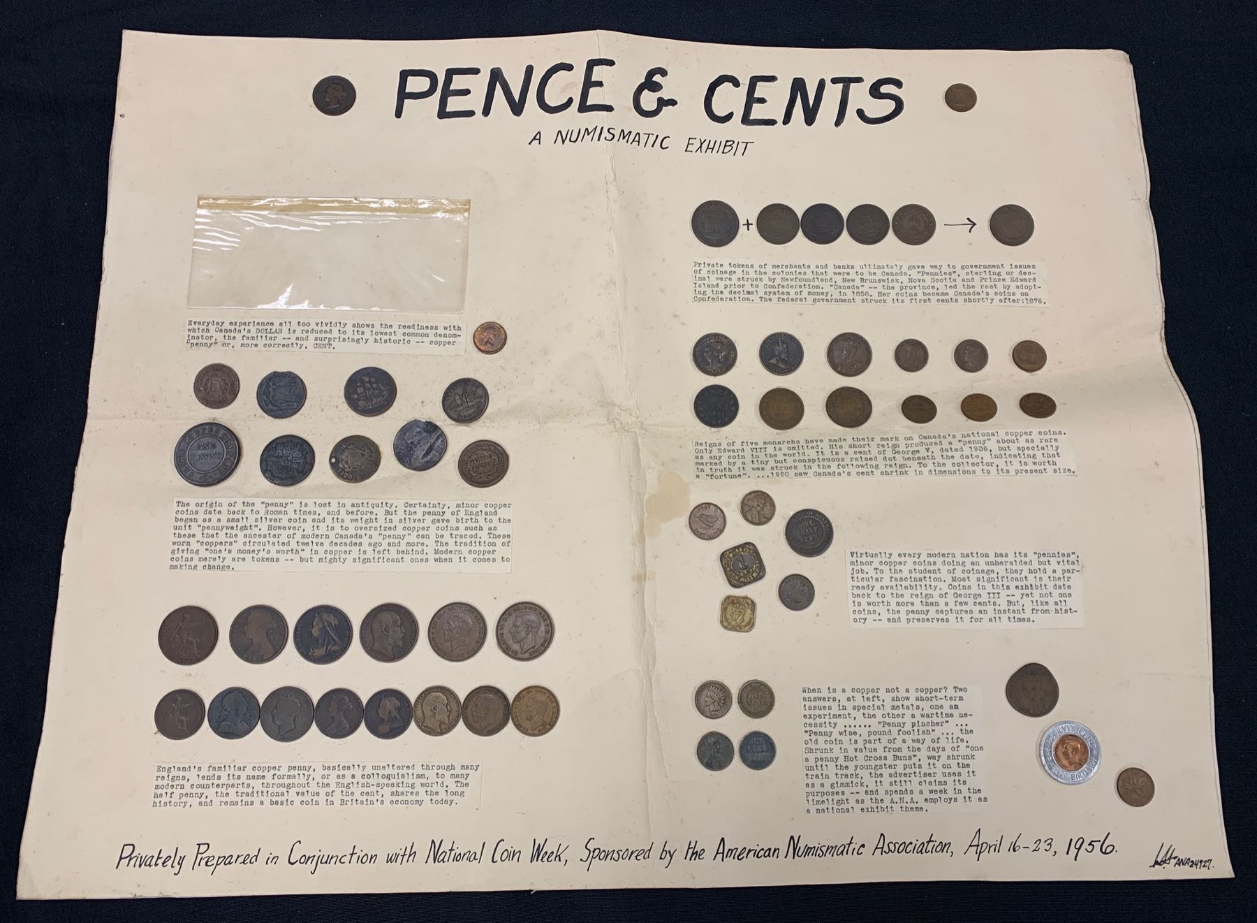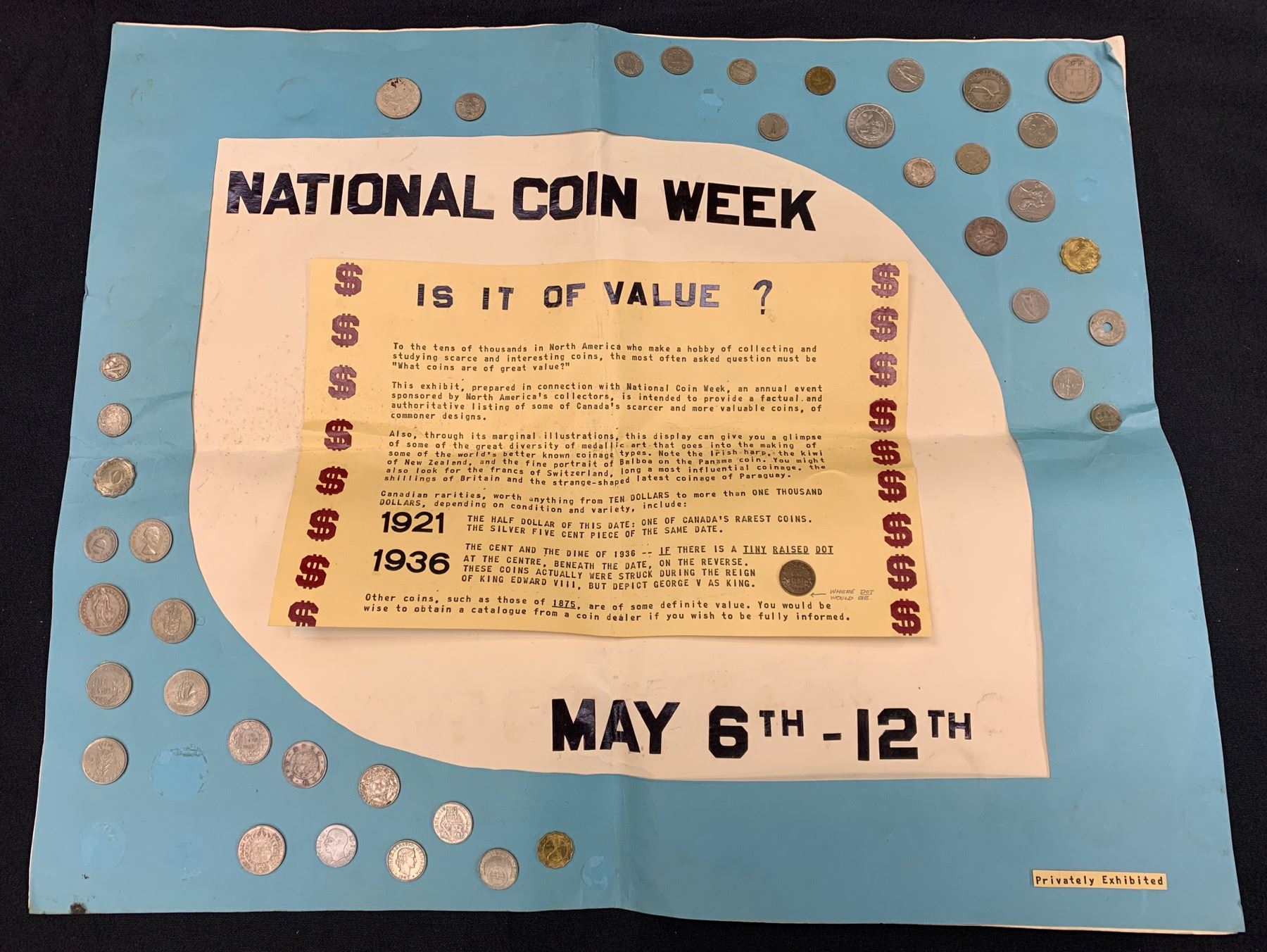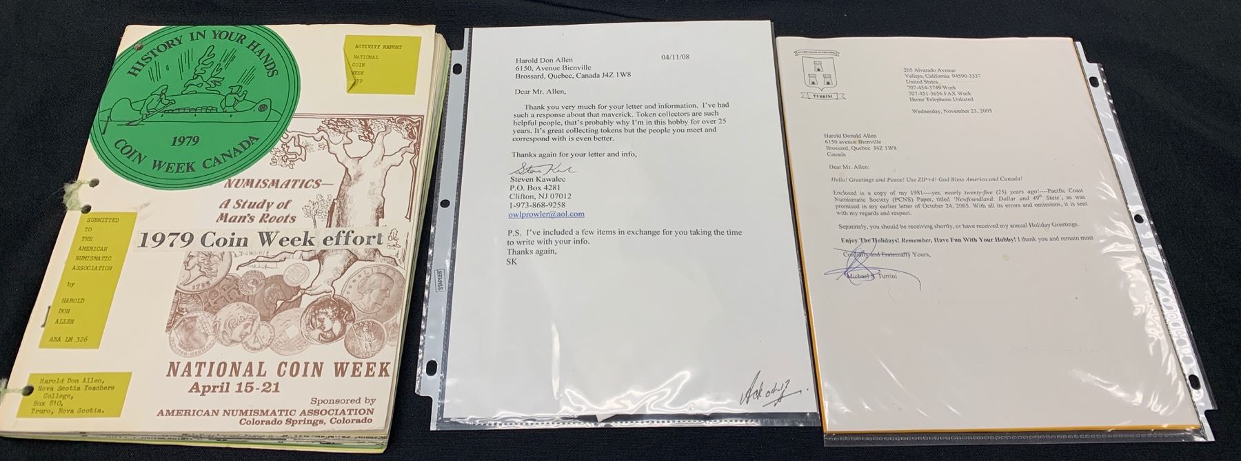 National Coin Week (United States) scrapbooks for 1979 that Dr. Allen put together; personal correspondence and 2 neat educational displays likely used on television featuring foreign coins and pence to cents.