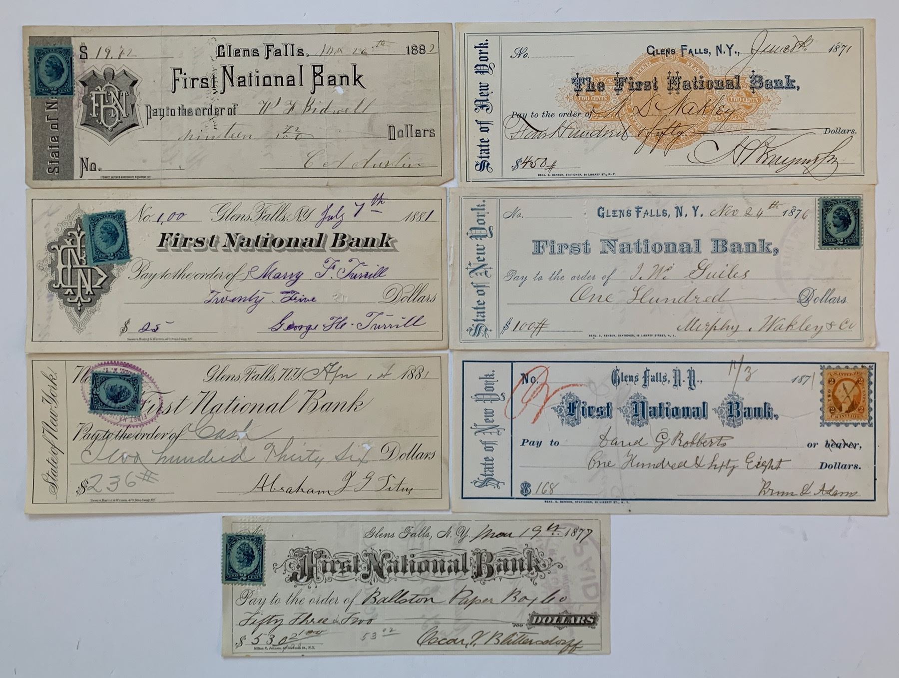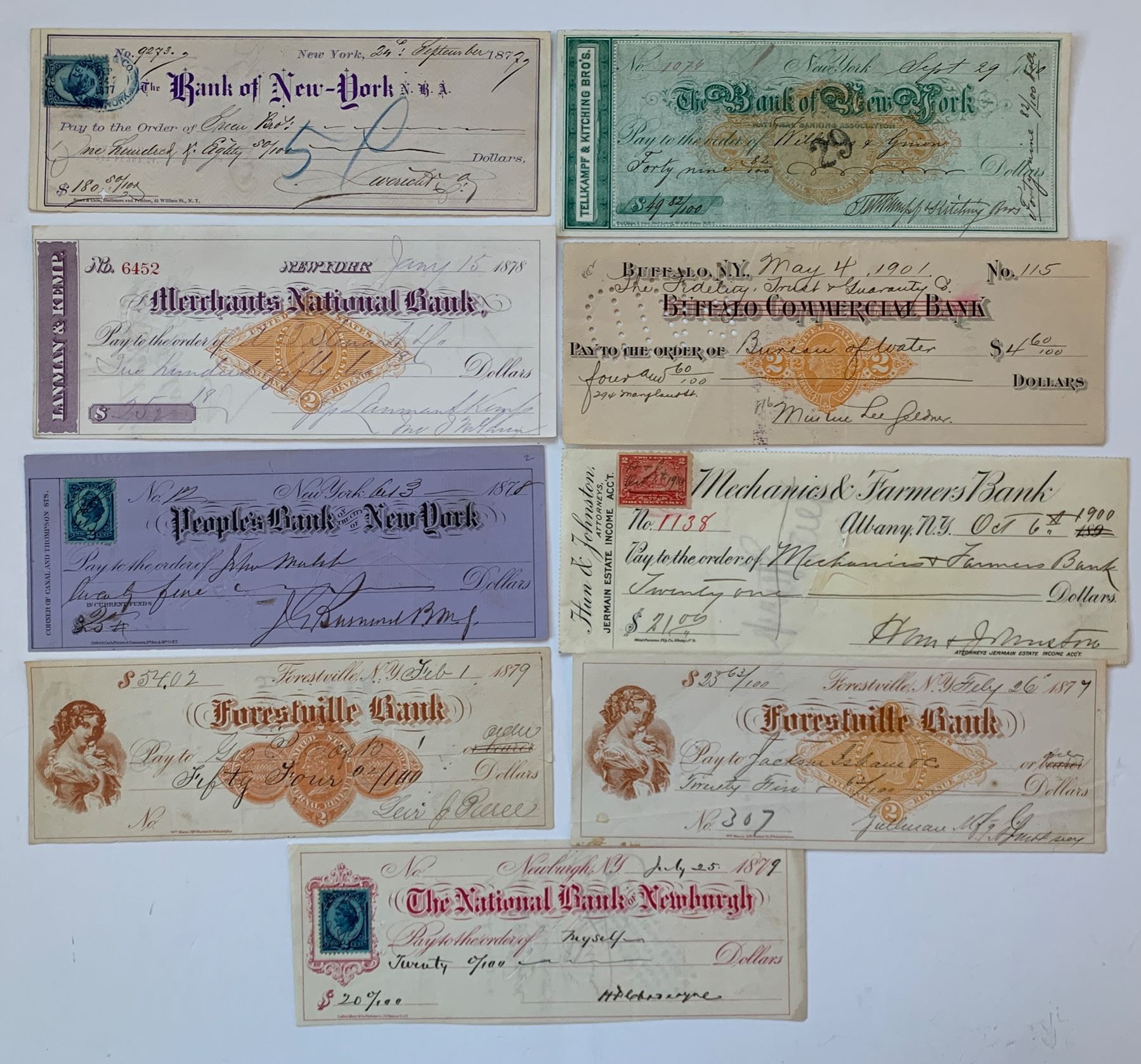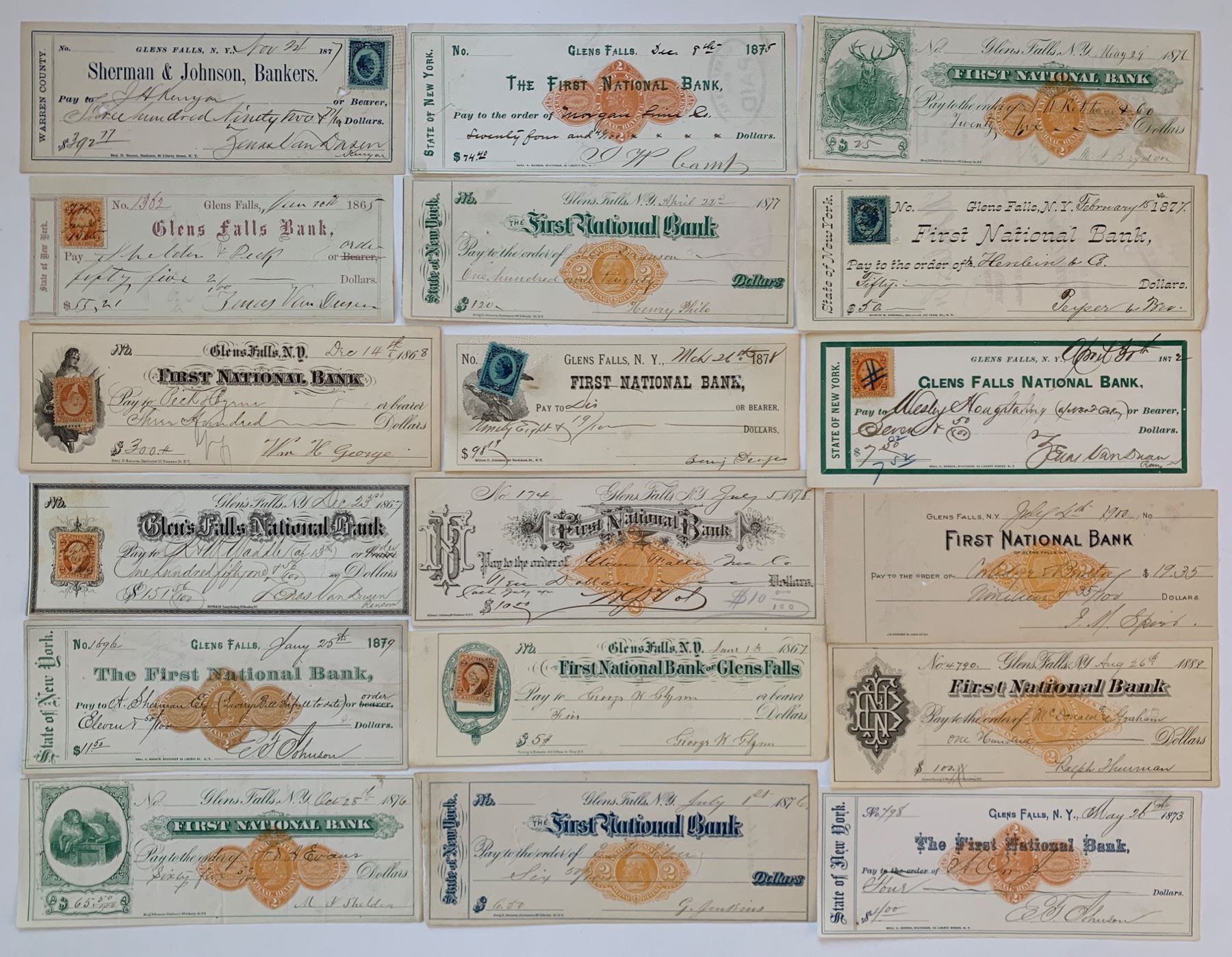 Glens Falls Bank, Glens Falls National Bank, First National Bank, and one from Sherman & Johnson private bank. 25 cheques, all appear to be different in large or small ways, dates run 1865 to 1900, most are 1860s and 1870s. Several have attractive vignettes. Clean lot, with internal cancellation cuts. Tax has been paid by adhesive revenue stamps or a variety of preprinted revenue stamps. - New York State. 27 cheques, including several very attractive pieces; dates run 1834 to 1903 but almost all are 1870s and earlier. Post Civil War cheques have tax paid by adhesive stamps or by preprinted revenue stamps with several varieties represented, including one in pink. A nice group.
