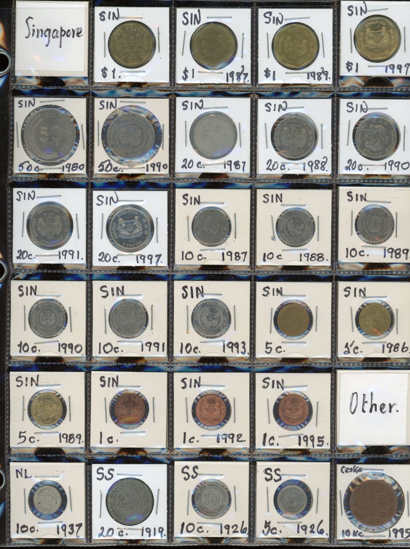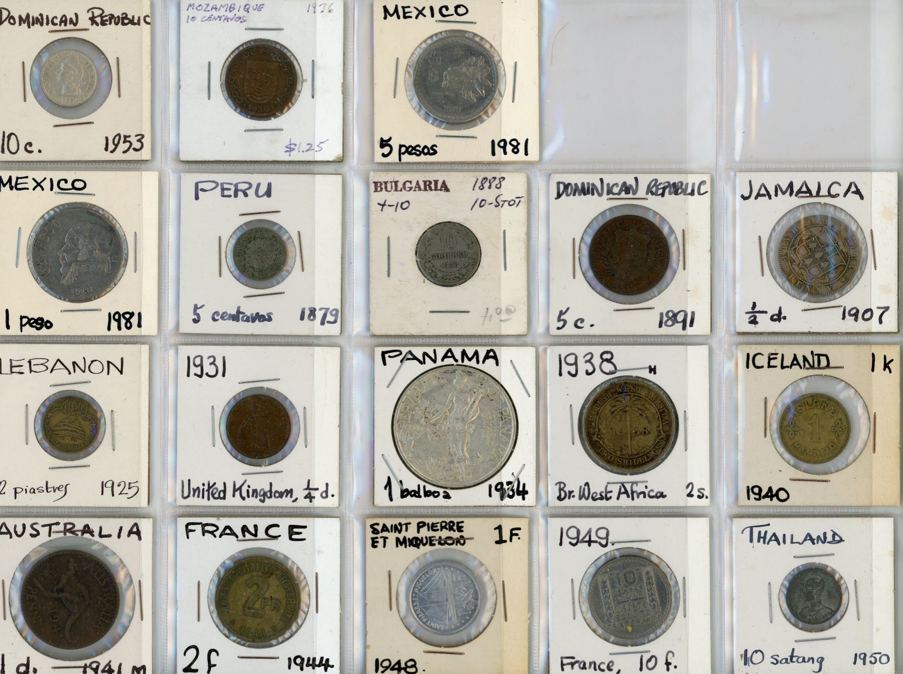 A substantial collection of world coins acquired by H. Don Allen on his world travels. Countries include Malaysia, United Arab Emirates, Belgium, Singapore, Dominican Republic, Mozambique, Mexico, Peru, Bulgaria, Jamaica, Lebanon, United Kingdom, Panama, British West Africa, Iceland, Australia, France, Saint Pierre Et Miquelon, Thailand & Straits Settlements. 198 Pcs