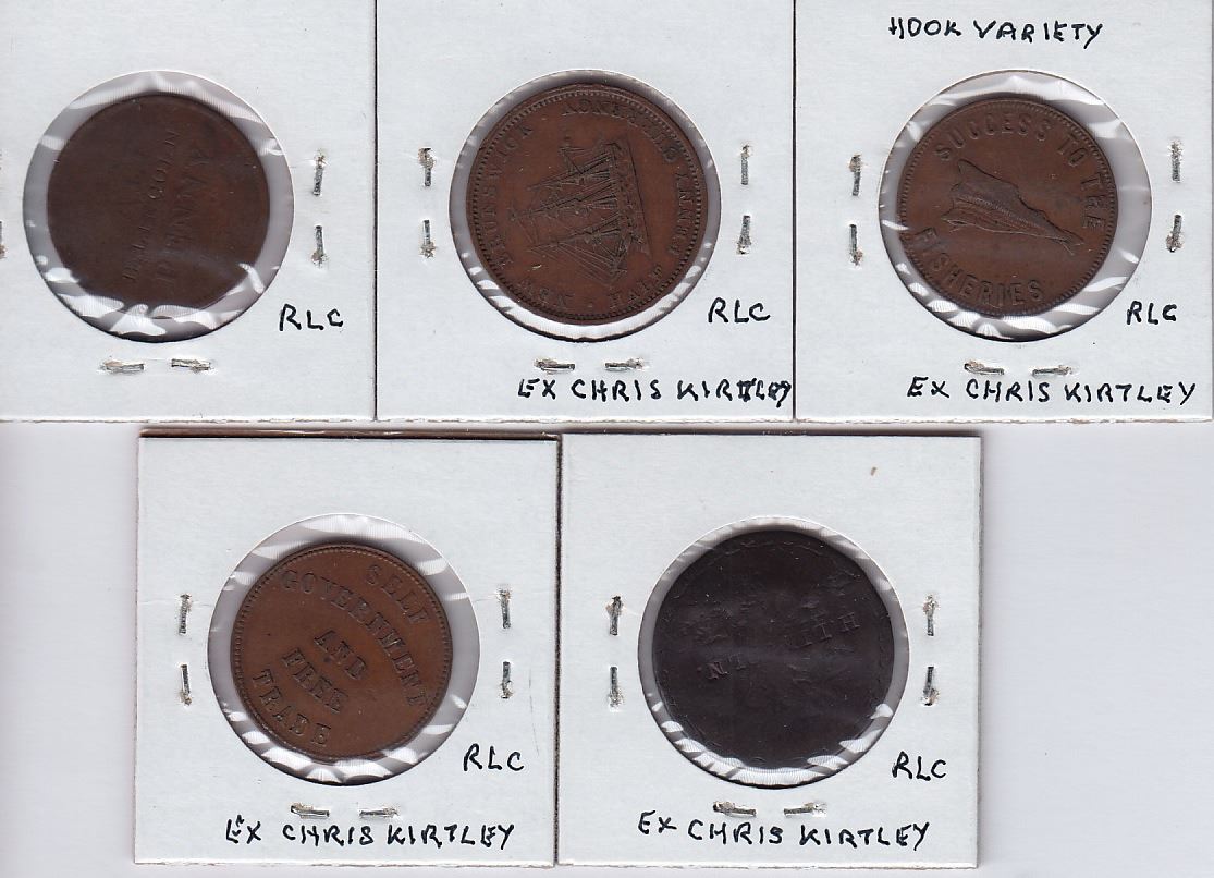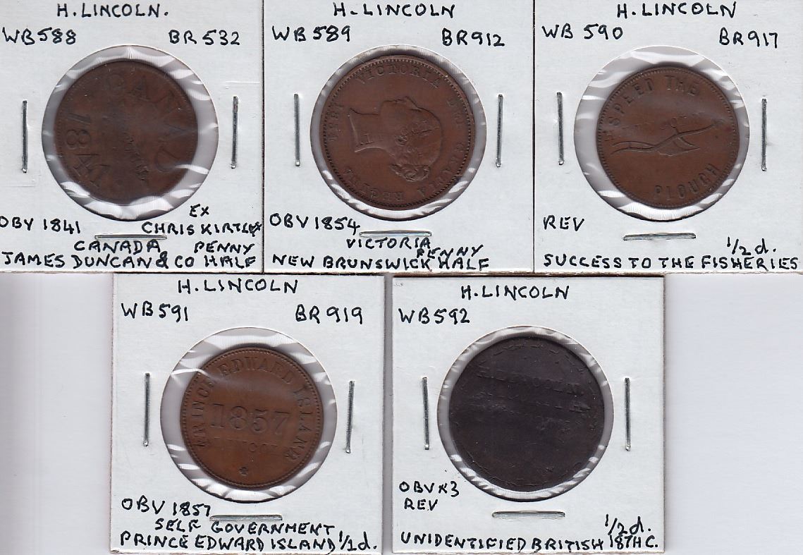 H. LINCOLN. on obv. & rev. of James Duncan & Co. ½ penny, 1841, Br 532 (M.I. 588, Brunk L-378); on obv. of New Brunswick ½ penny, 1854, Br 912 (M.I. 589, Brunk L-378); on rev. of Success to the Fisheries ½ penny, Br 917 (M.I. 590, Brunk L-378); on obv. of Prince Edward Island ½ penny, 1857, Br 919 (M.I. 591, Brunk L-378); on obv. three times & once on rev. of unidentified British 18th C. ½ penny token (M.I. 592, Brunk L-378). 5 Pcs.