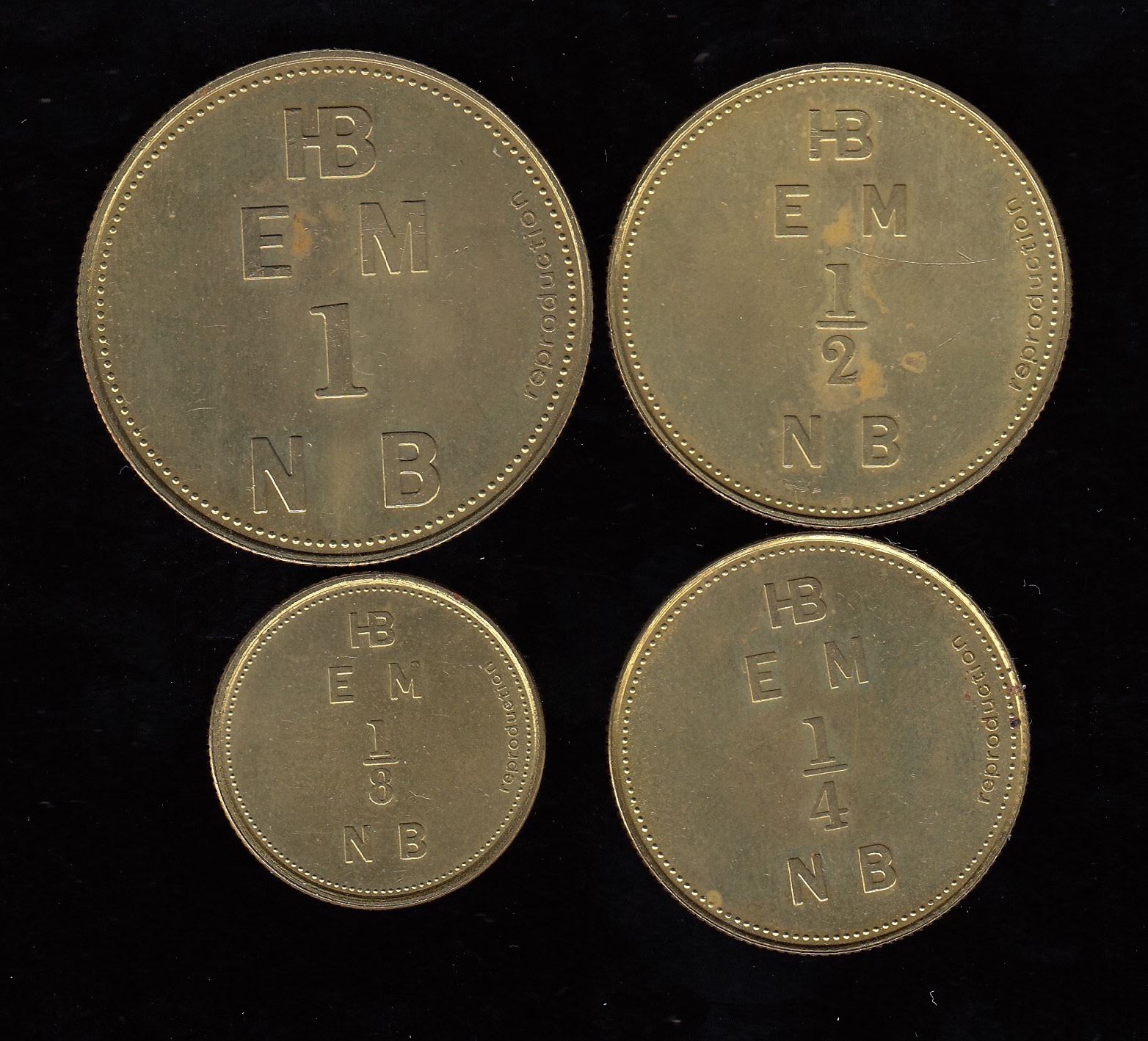 Excellent repro's of BR 926, 927, 928, 929. The hallmark of each HBC token collection are the four Made Beaver tokens of the late 19th century Eastmain District. 4 Pcs.