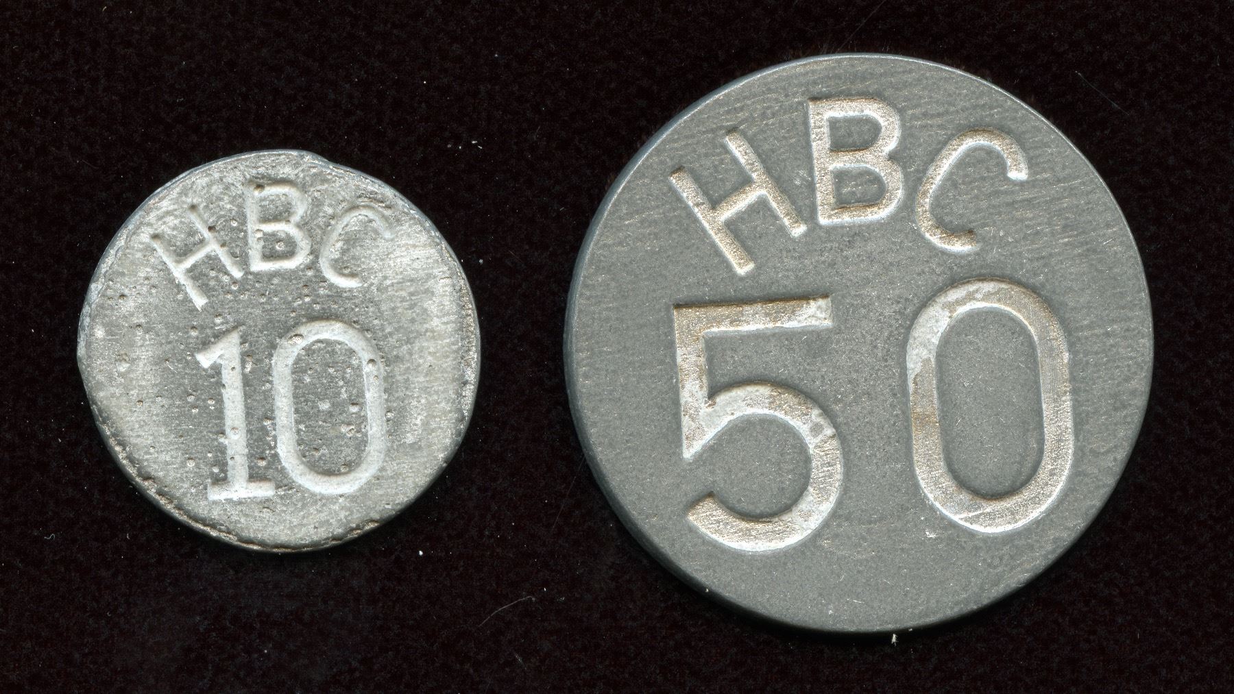 Unlisted by Gingras. The discovery of the Hoard was described, and pieces analyzed, by Mr. Greg Ingram and printed in several numismatic publications, including Numismatic Canada, in the March 2010 issue [Vol. 9, #1, Issue 33, pages 2-11]. Mr. Ingram indicated only denominations of 10, 50, and 100 were found with no specimens for the 5 and 25. The tokens are somewhat similar to the 1946 Eastern Arctic issue [Gingras 285, a, b, c and d] but differ in size and weight. The Hoard contained the following non-corroded pieces: 25 of the 100 denomination, 69 of the 50 denomination, and 27 of the 10 denomination; there were also 125 badly corroded 10 denominated pieces. The incuse “HBC” and the numerals have a white appearance, from what appears to be the result of titanium oxide in the aluminum alloy. This lot is comprised of the 10 and 50 denominated tokens. Weight & Diameter: 1.61gms-21mm; 3.29gms-29mm; respectively. Alum. base, incuse. EF/AU. 2 Pcs.