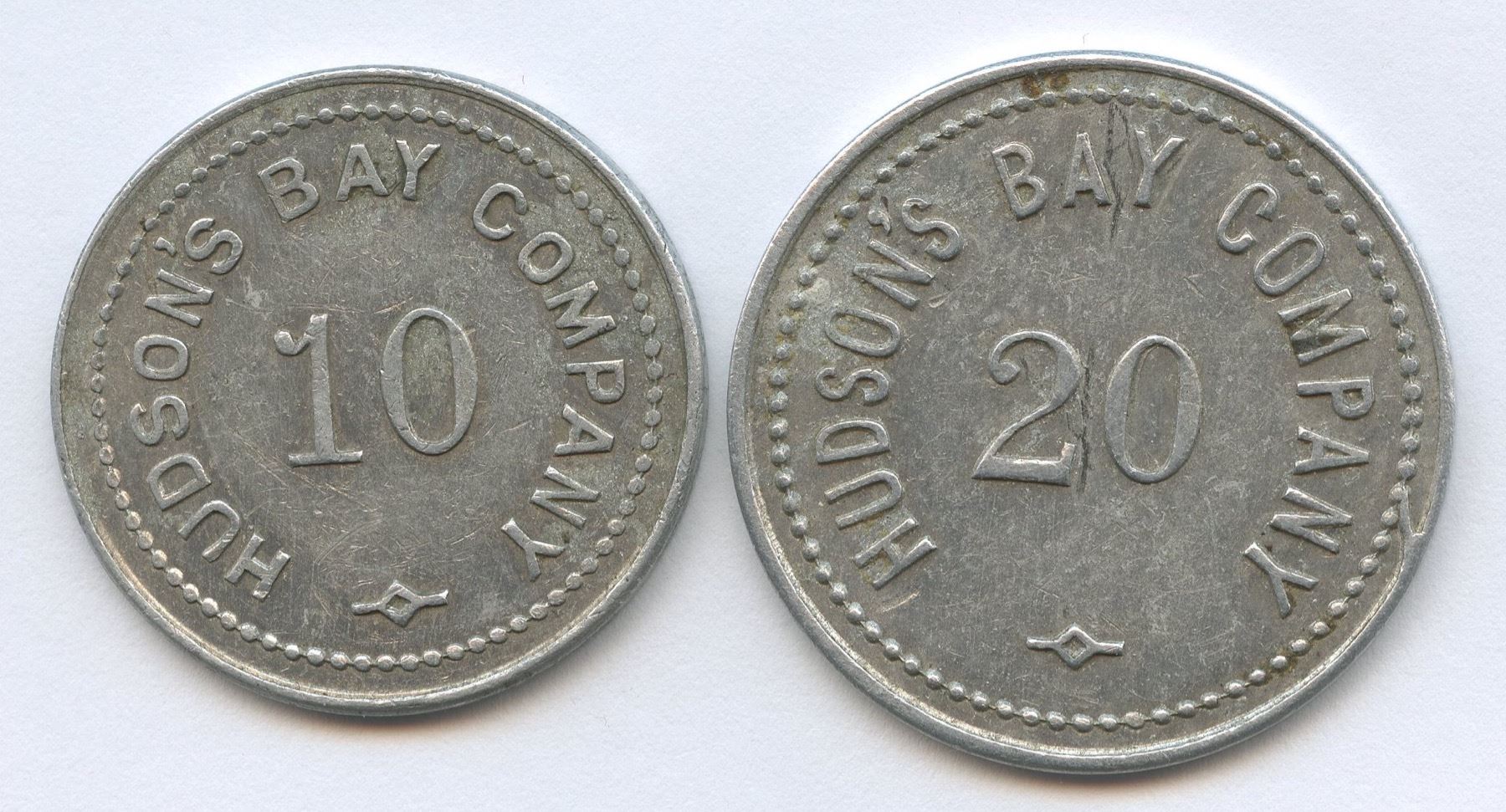 Includes: 10 and 20 M.B. alum. Diameters 29 & 32mm. The St. Lawrence and the Labrador Districts were amalgamated in June 1922, and these tokens are believed to have been issued the following year. There are two sets that differ in size of lettering and numerals, and different devices at bottom. This lot is comprised of Gingras 260b and c. 2 Pcs. VF-EF.