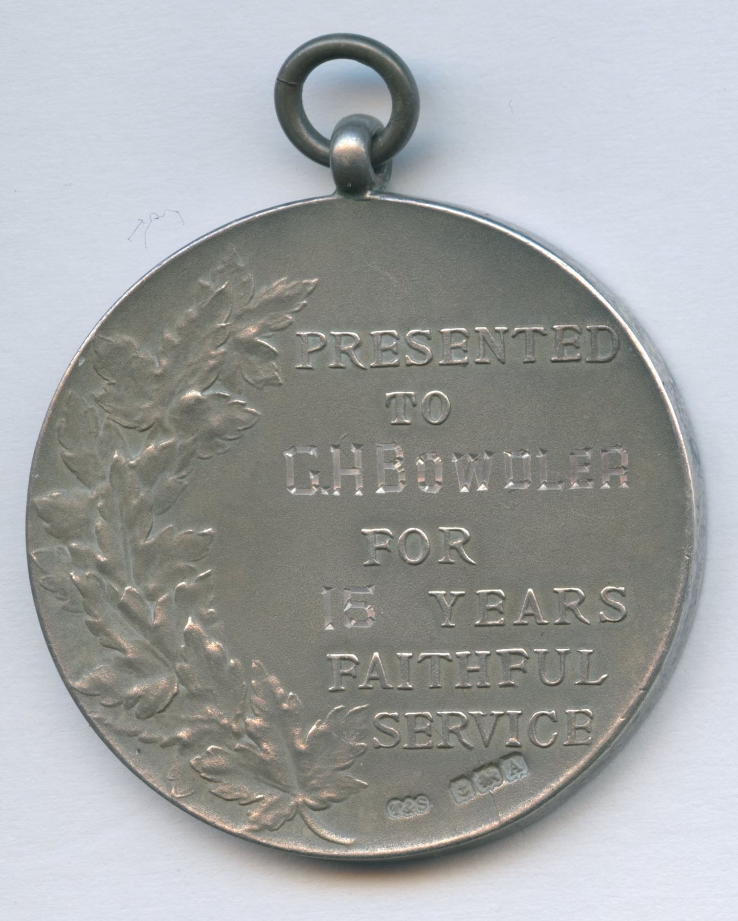 Named to GH Bowdler, Dated 1920, for 15 years of service with hanger. AR, Hallmaked. Gingras S 116. AU/Unc.