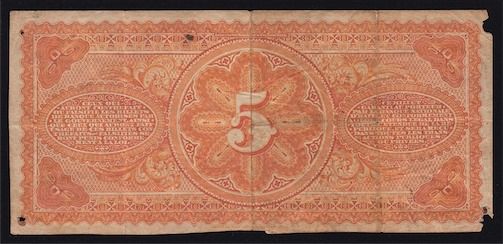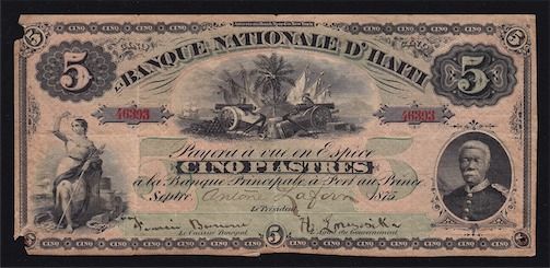 Haiti - 5 Piastres 1875, P-72, two pinholes and two missing corners, Fine.