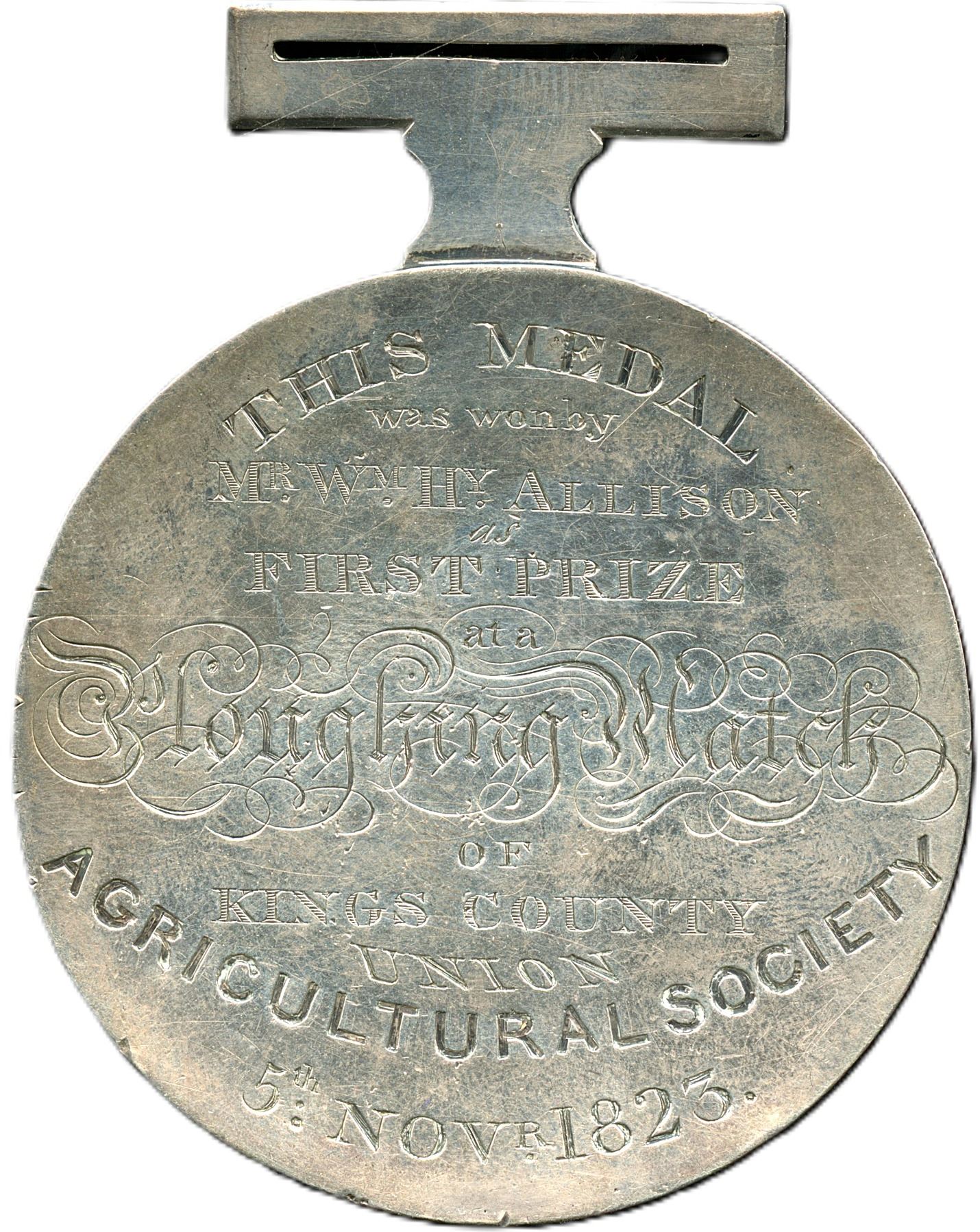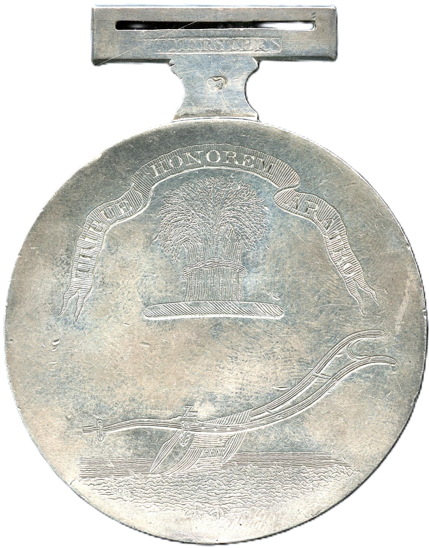 47 x 60mm 58.34g Hallmarked "R. U. MARSTERS" (Halifax). Hand engraved plough with wheatsheaf motto above "Tribue Honorem Aratro" (Give honor to the plough). Reverse engraved in different fonts "This Medal / was won by / Mr Wm Hy Allisom / at a / Ploughing Match / Of / Kings County / Union / Agricultural Society / 5th Novr 1823". An exceptional early hand engraved agricultural medal, EF and Extremely Scarce. 1pc. Ex. Waddingtons June 1991 lot 203, Ex: Tim Henderson. From the Geoffrey Bell Collection.