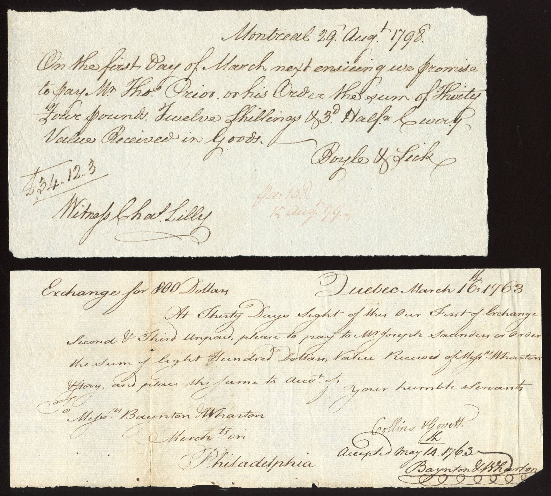 Hand written eighteenth century financial documents: First of Exchange, drawn by early Quebec Merchants Collins & Govett on Baynton & Wharton, Philadelphia, 1763. The merchants were unable to make headway against the French-Canadian traders, and did not thrive. Secondly, Promissory Note, Montreal, 1798. Opportunities for research here.