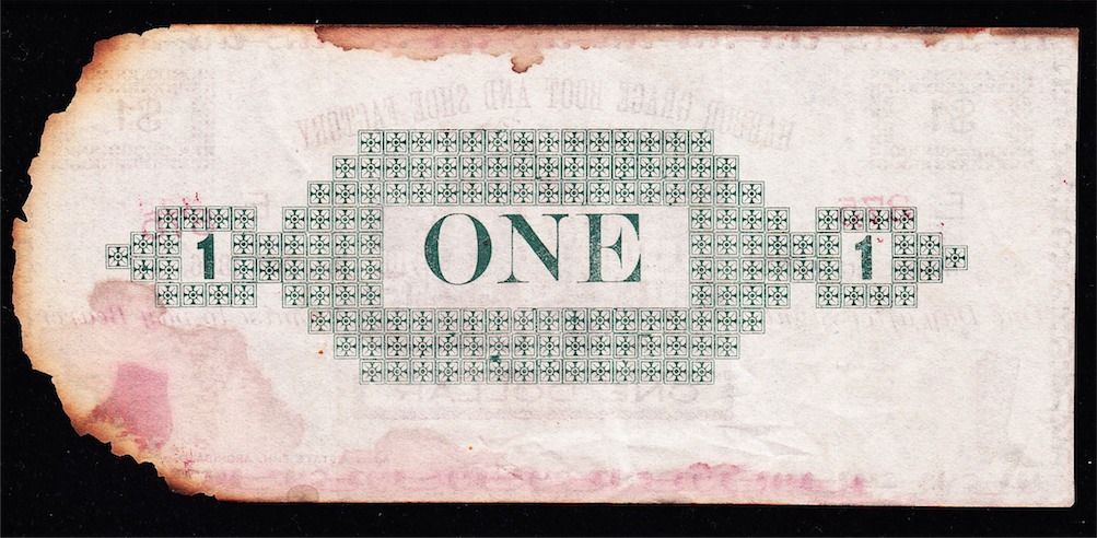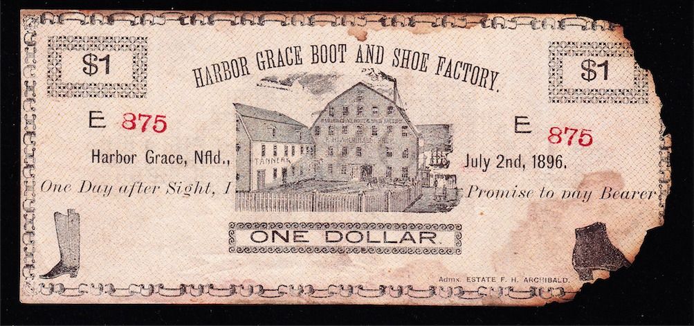 Harbor Grace Boot and Shoe Factory - CH NL-35-10-04R, In Charlton's "Numismatic Merchant Scrip" we learn that this company started in 1877 in Harbor Grace where Frank Archibald was a shoemaker. He later established a tannery and factory. The name of the company was changed in 1898, therefore the notes were used sometime between 1877 and 1898. There are four $1.00 notes known, all with fire damage on the right hand margin. Rare.