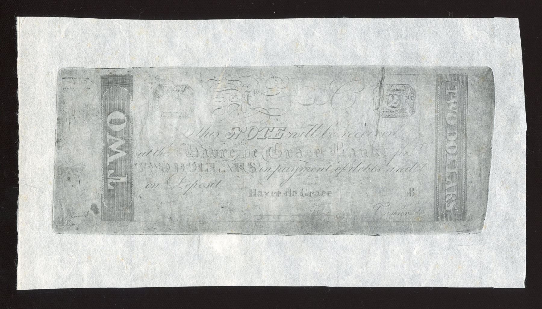 Havre de Grace Bank $2, Maryland, 1810s-1820s, Probable Counterfeit, Reprint.