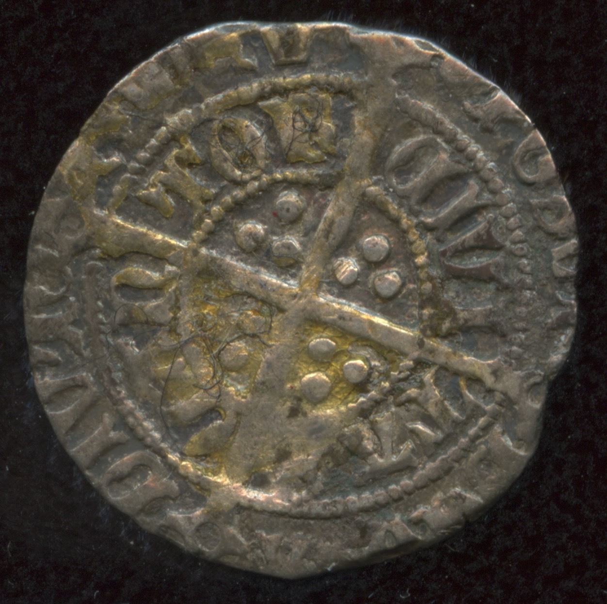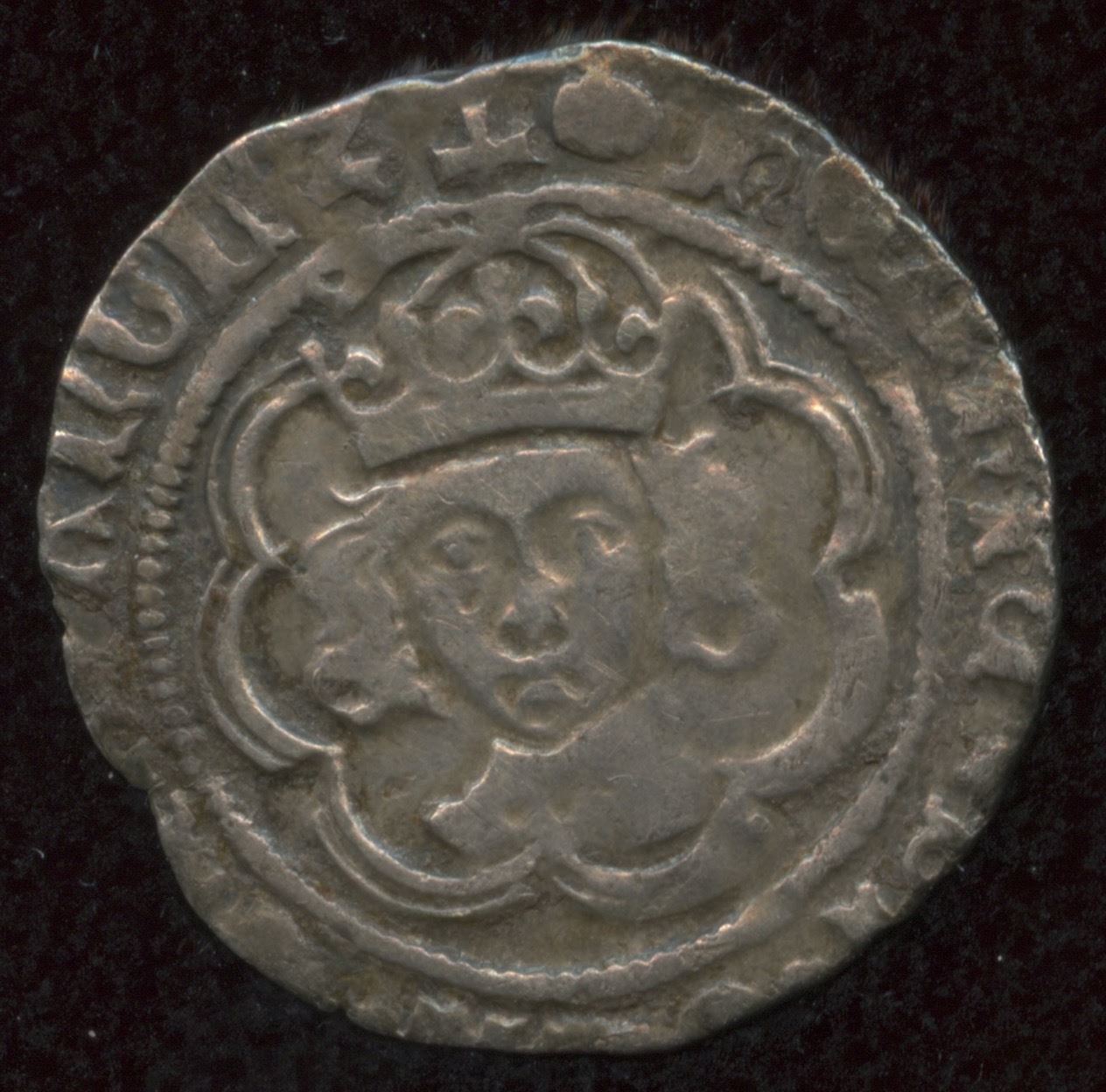 AR Halfgroat (18mm, 1.26g). Facing bust issue. Canterbury mint; mm: Tun. Crowned facing bust in tressure of arches; crown of two arches, Long cross; trefoils in quarters, CAN/LON TOR/DON. SCBC 2209. Near VF, toned.