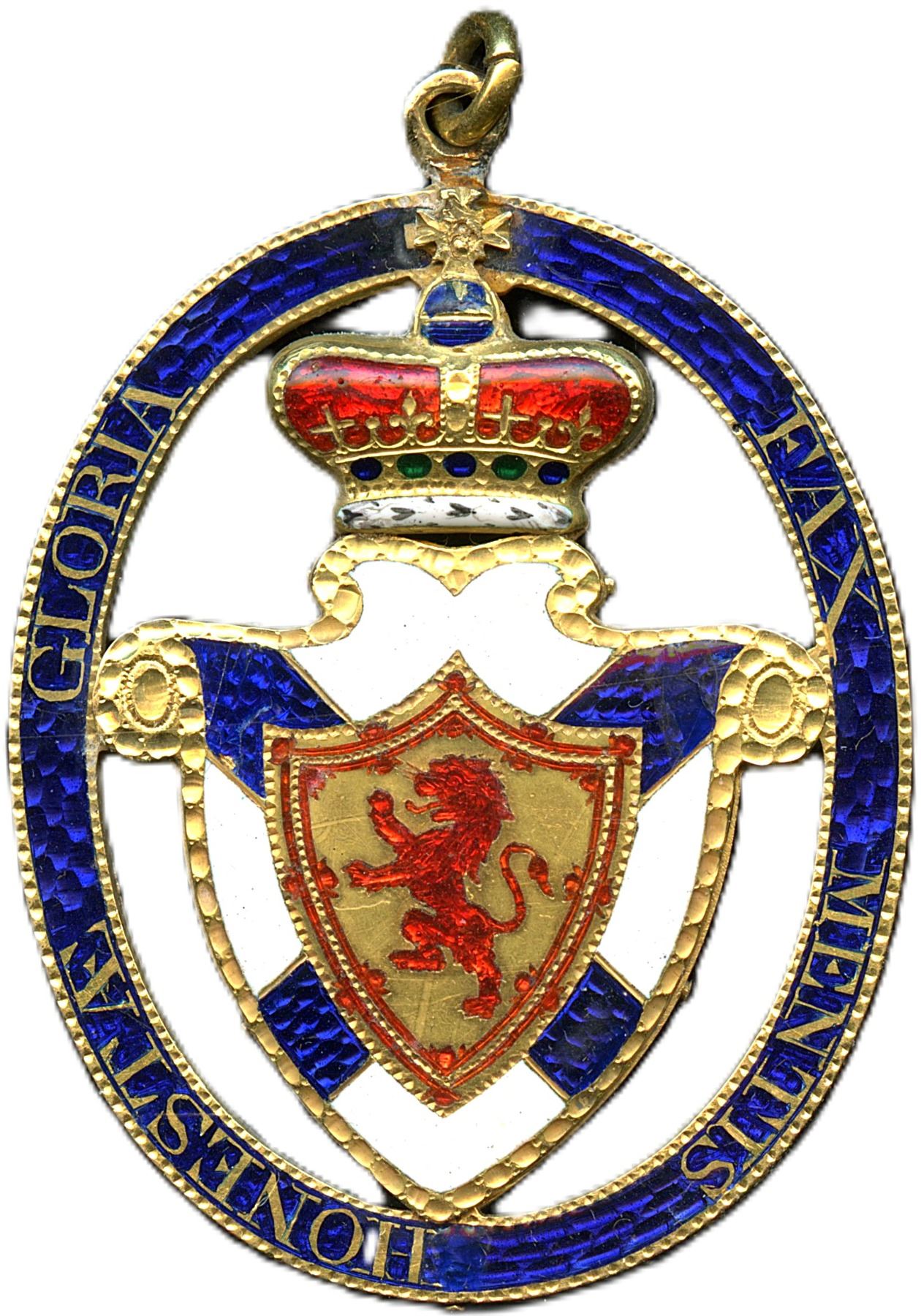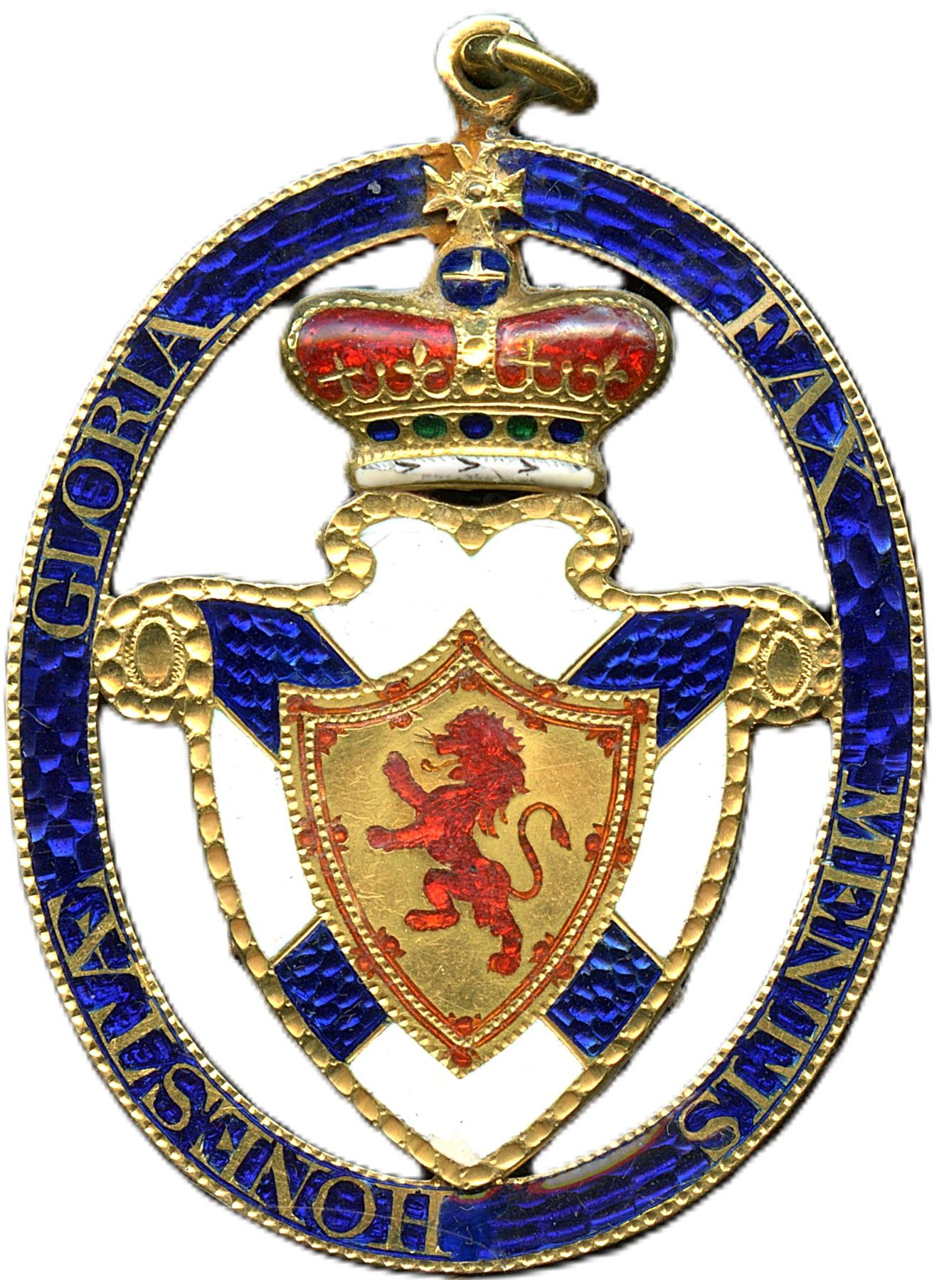 The "Honestae Gloria Fax Mentis" is the motto of the Baronet’s Badge of Nova Scotia, established in 1629 by King Charles I. The Latin phrase translates to "Glory is the torch that leads on the honourable mind". Medal is 90% gold with enamels, crowned shield of arms bearing the lion rampant of Scotland set before the cross of St. Andrew with motto 'Honestae Gloria Fax Mentis', Awarded to Sir John Murray 8th Baronet (1768-1827), Sir John was a British Army Officer who led a brigade under Wellington, in the Peninsular War. 34 x 47mm, 16.6g, With Ribbon. UNC, Seldom offered historical award. Ex. Jeffrey Hoare. 1pc. From the Geoffrey Bell Collection.