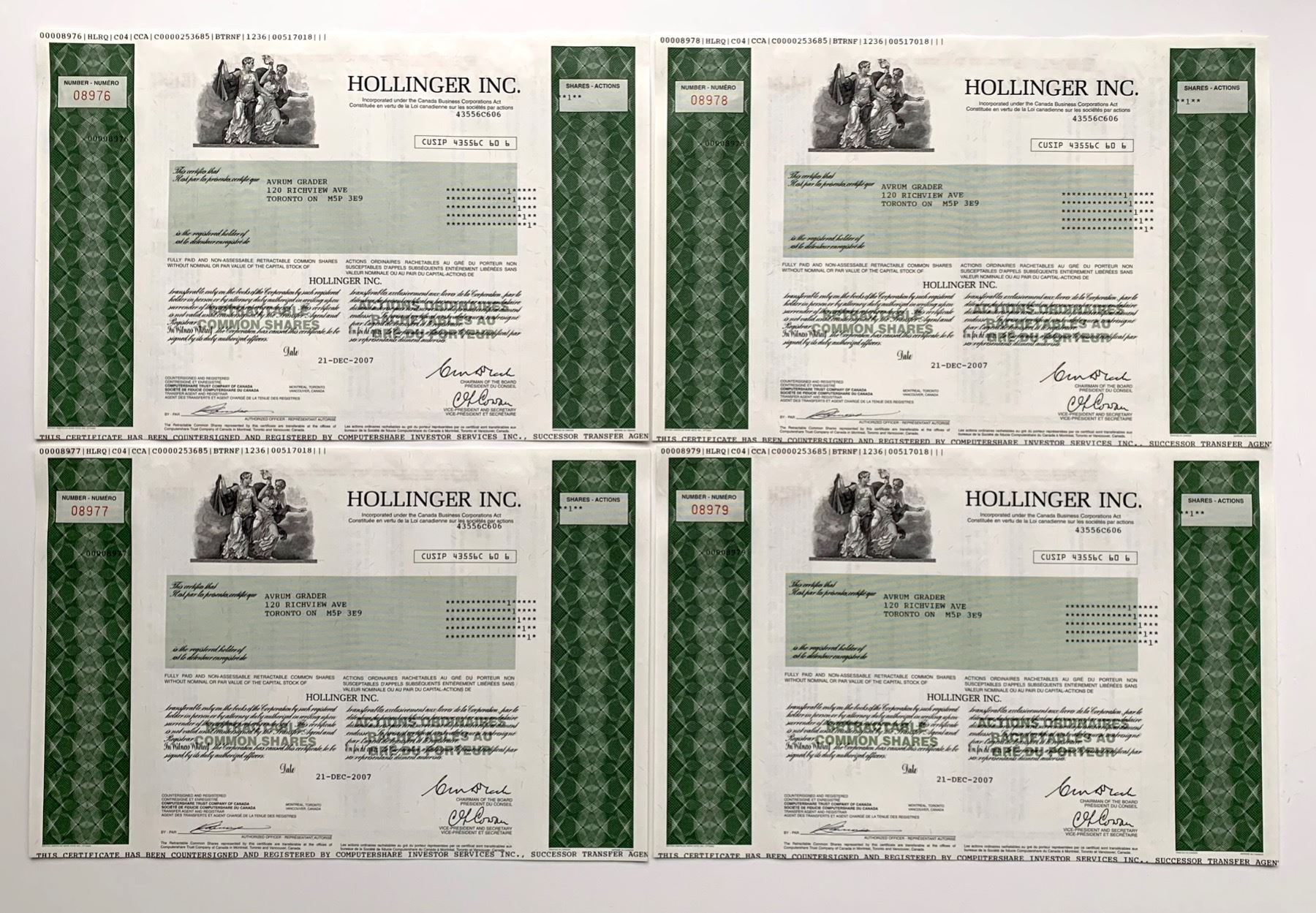 1 Share Green 2007. Allegorical figures XF-UNC (lot of 4 certificates). Facsimile signature of Conrad Black. This company's origins date back to 1909 when it was known as Hollinger Gold Mines Ltd. Hollinger became a media holding company controlled by Conrad Black. Its flagship newspapers included the Daily Telegraph in London, The Chicago Sun-Times and the Jerusalem Post. A series of non-compete payments made to Conrad Black and senior members of his executive team prompted allegations of looting of the management and the minority shareholders savaged each other in court and in the press. Conrad Black ended up being found guilty of mail fraud and obstruction of justice. Hollinger ultimately went bankrupt in 2007 amid massive debts and a changing media environment. Interesting scandal and very collectible.