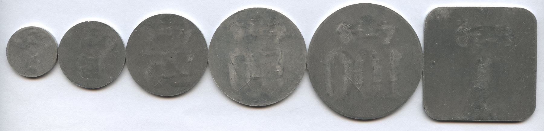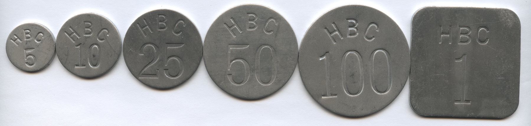 Hudson's Bay Company Eastern Arctic Token Set of 6 - Al, 19-mm to 40-mm uniface tokens issued by the oldest department store still in business today, opened for business in 1670. The tokens in this lot were in use in the Eastern Canadian Arctic from the middle '40s through the early part of the '60s. The denominations are 5, 10, 25, 50, 100 and 1.00, and all have the letters HBC (Hudson's Bay Company) and the denomination incused. The tokens are listed in the standard reference catalog, Medals, Tokens, and Paper Money of the Hudson's Bay Company by Larry Gingras. The catalog numbers are 285, 285a, 285b, 285c, 285d and 285e. 6 Pcs.