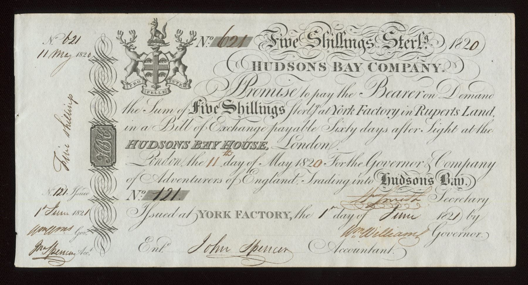 MB10-06bi. Hudson's Bay Company One Pound Sterling certificate for the York Factory in Ruperts Land, dated 11 day of May, 1820. About uncirculated condition. Payable sixty days after sight at the Hudson Bay House, London. From its long-time headquarters at York Factory on Hudson Bay, the company controlled the fur trade throughout North America for several centuries. Undertaking early exploration, its traders and trappers forged relationships with many groups of aboriginal peoples. Its network of trading posts formed the nucleus for later official authority in many areas of Western Canada and the United States. Fairly rare and certainly desirable; especially in this condition. S/N: 621.