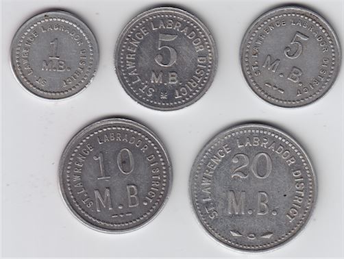 Hudson's Bay Company St. Lawrence Labrador District, 1 M.B. small letters; 5 M.B. small letters; 5 M.B. large letters; 10 M.B. large letter; 20 M.B. large letters. Al. 5 Pcs.